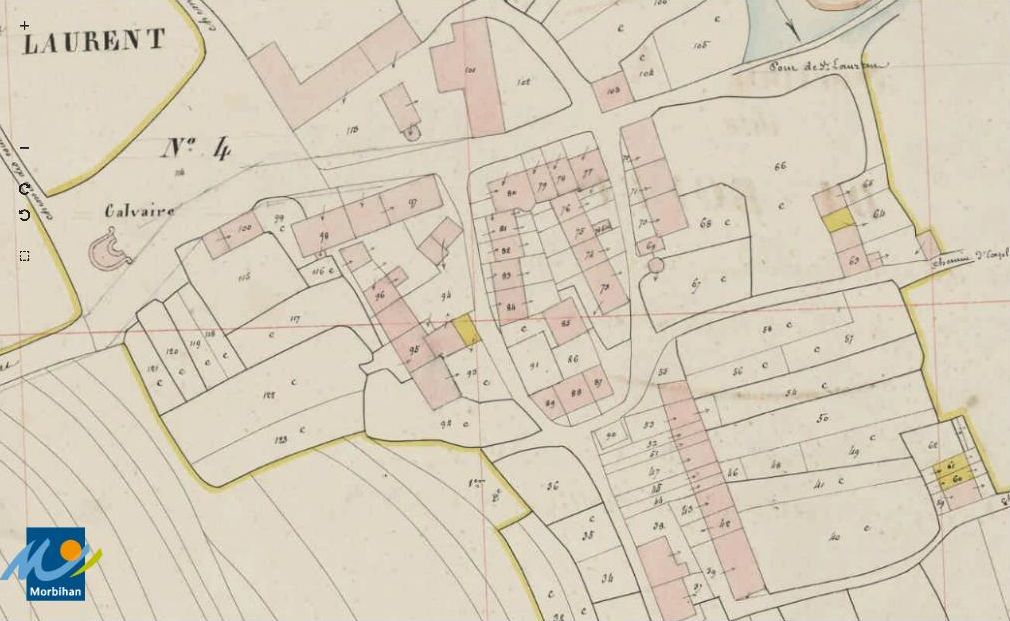Le bourg de Saint-Laurent-sur-Oust sur le cadastre de 1840 (A. D. du Morbihan, série 3 P 264/5)Immatriculation