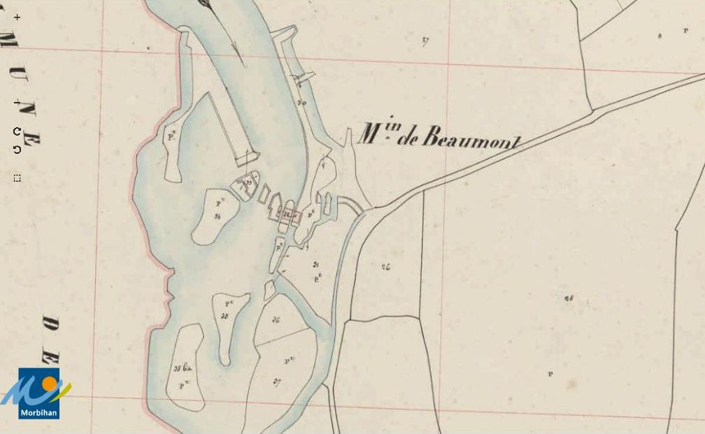 Le moulin à eau du manoir de Beaumont sur le cadastre de 1840 (A. D. du Morbihan, série 3 P 264/12)Immatriculation