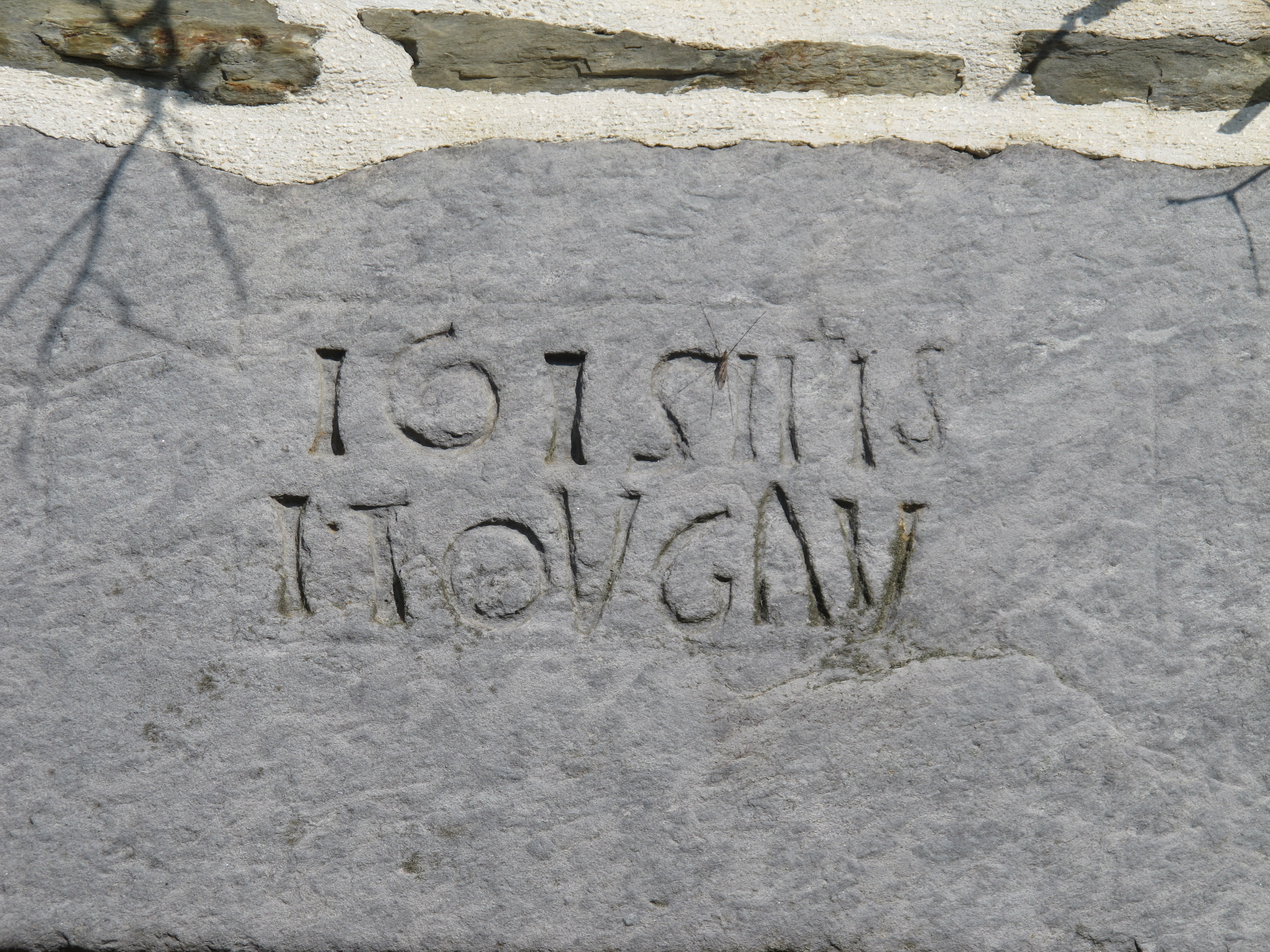 Ferme 5, aujourd'hui maison, date et inscription gravées sur le linteau de la porte : 1615 IHS i. IOUGAU (état en 2013)Immatriculation