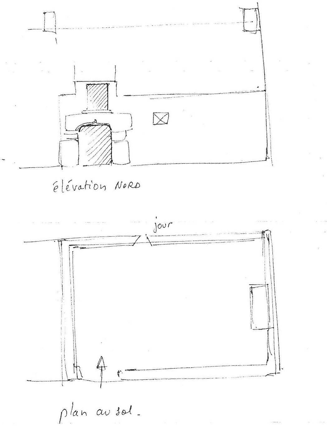 Maison : élévation nord et plan au sol du rez-de-chaussée (schéma réalisé en 1983 par J. P. Ducouret)Immatriculation