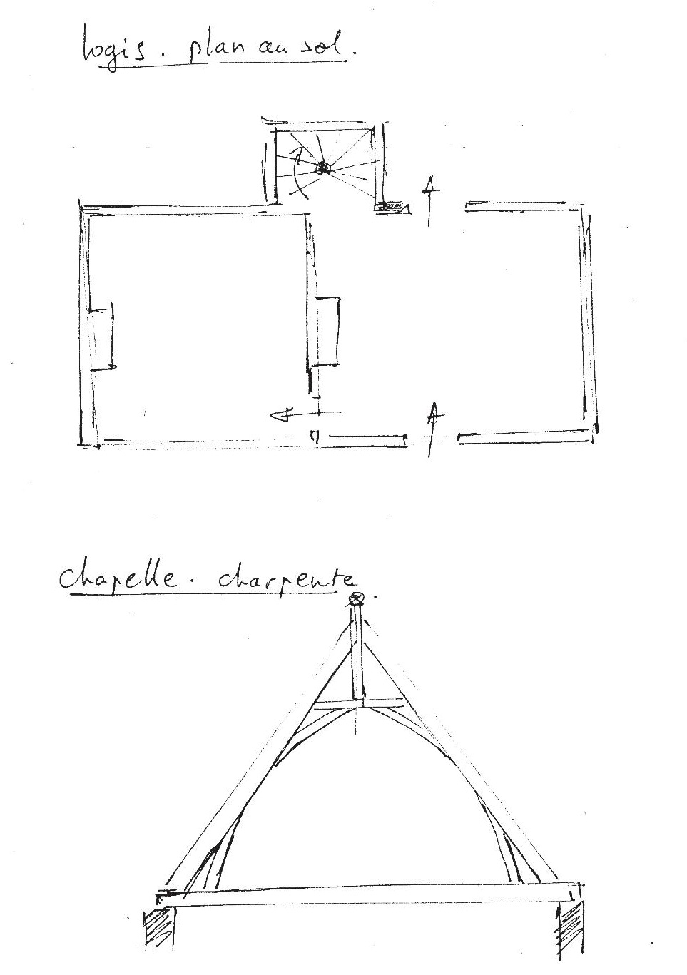 Manoir : plan au sol du rez-de-chaussée du logis et coupe transversale d'une ferme de charpente (schémas réalisés en 1983 par J. P. Ducouret)Immatriculation