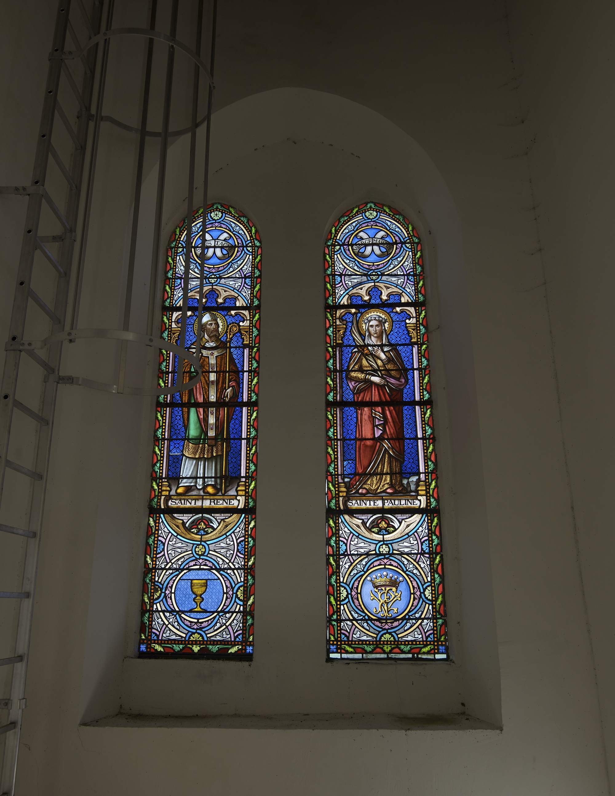 Vitraux, Saint René, Sainte Pauline avec les initiales de P.F.V pur Pauline de Ferron de la VairieImmatriculation