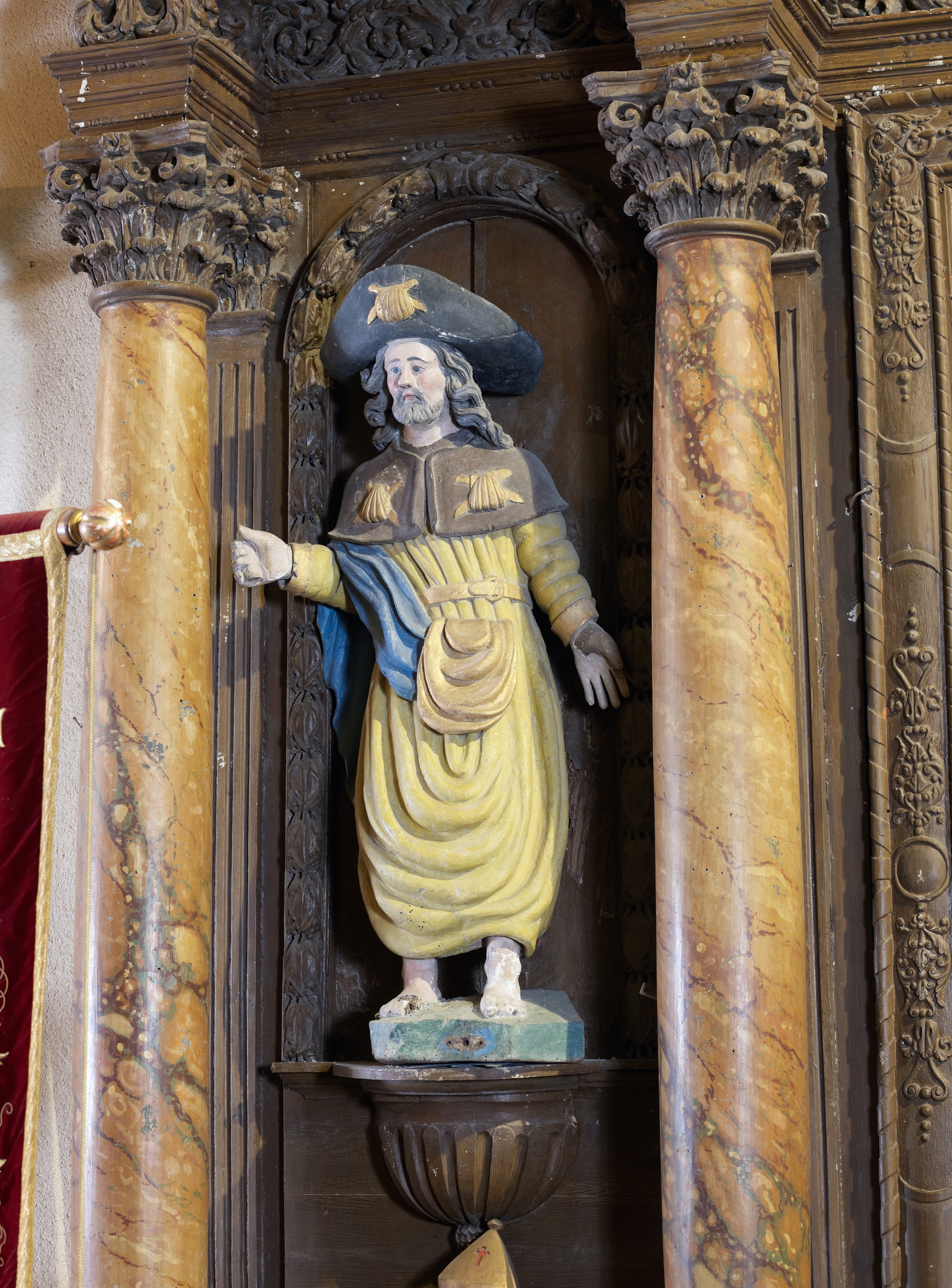 Ploubezre : église paroissiale, vue intérieure, retable sud, statue de saint Jacques le MajeurImmatriculation