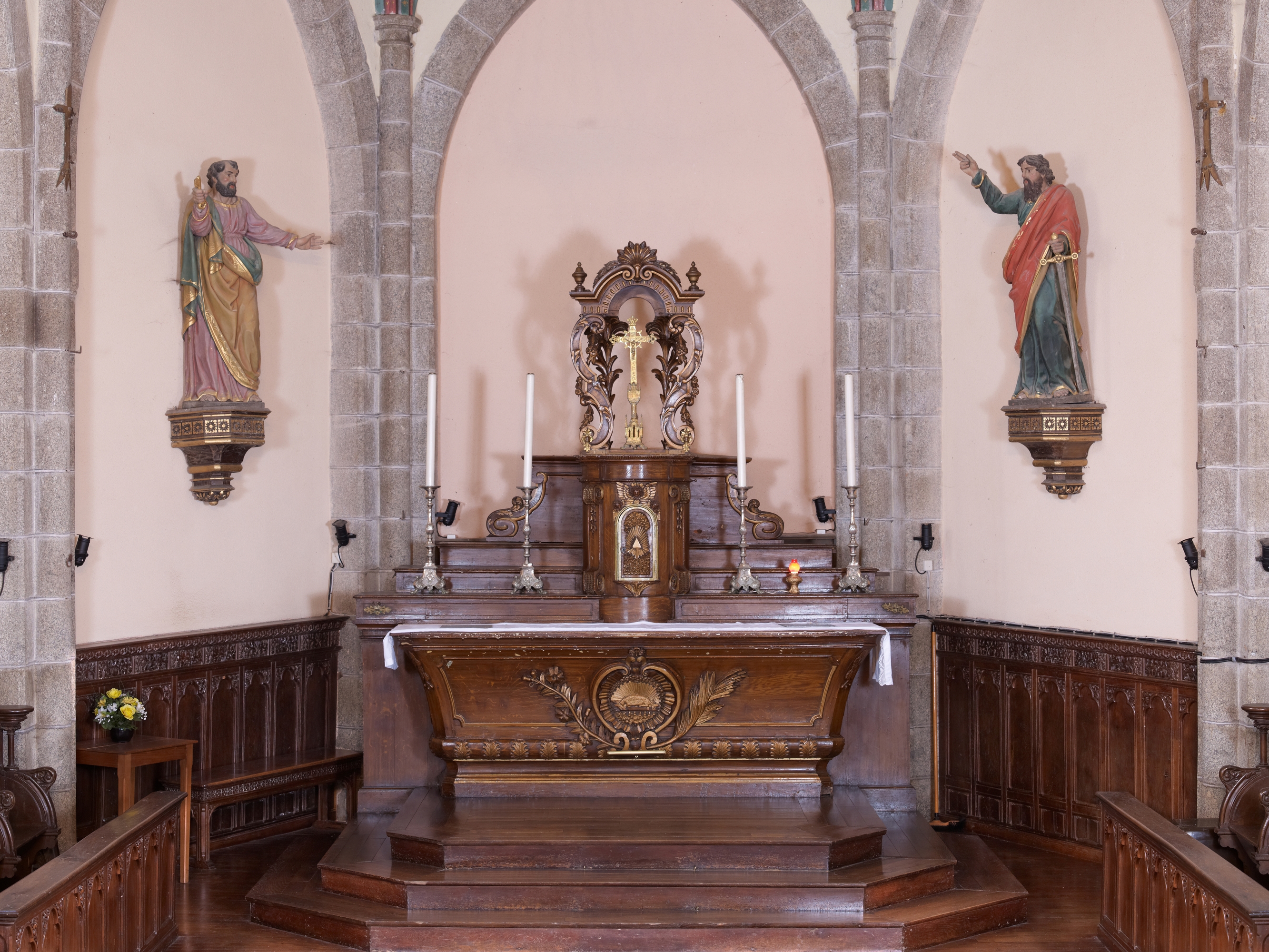 Ploubezre : église paroissiale, vue intérieure, chœur, maitre-autel et statuesImmatriculation