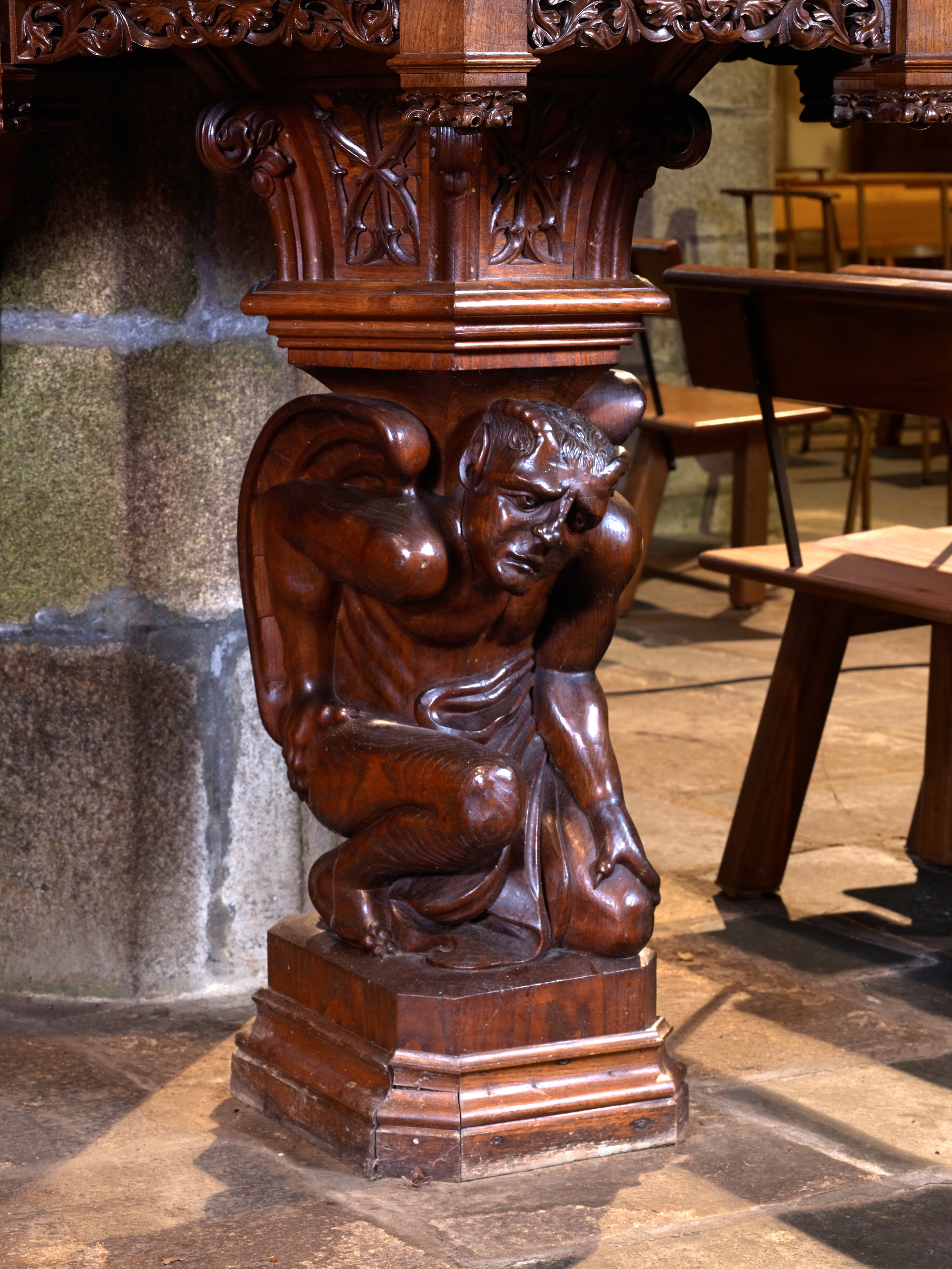 Ploubezre : église paroissiale, vue intérieure, chaire à prêcher datée de 1902, détail du DiableImmatriculation