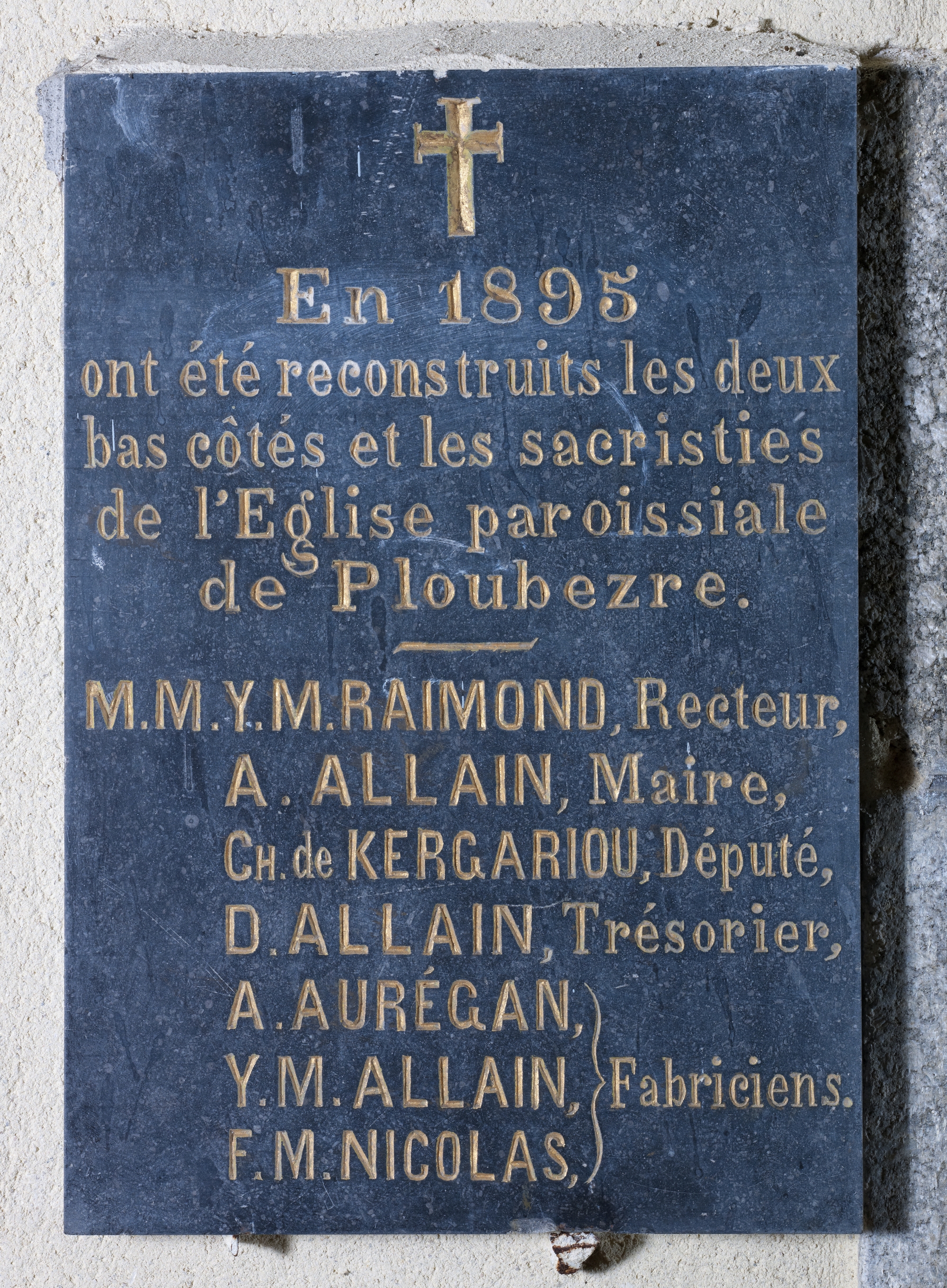 Ploubezre : église paroissiale, vue intérieure, plaque commémorative pour la reconstruction des deux bas-cotés et les sacristies en 1895Immatriculation