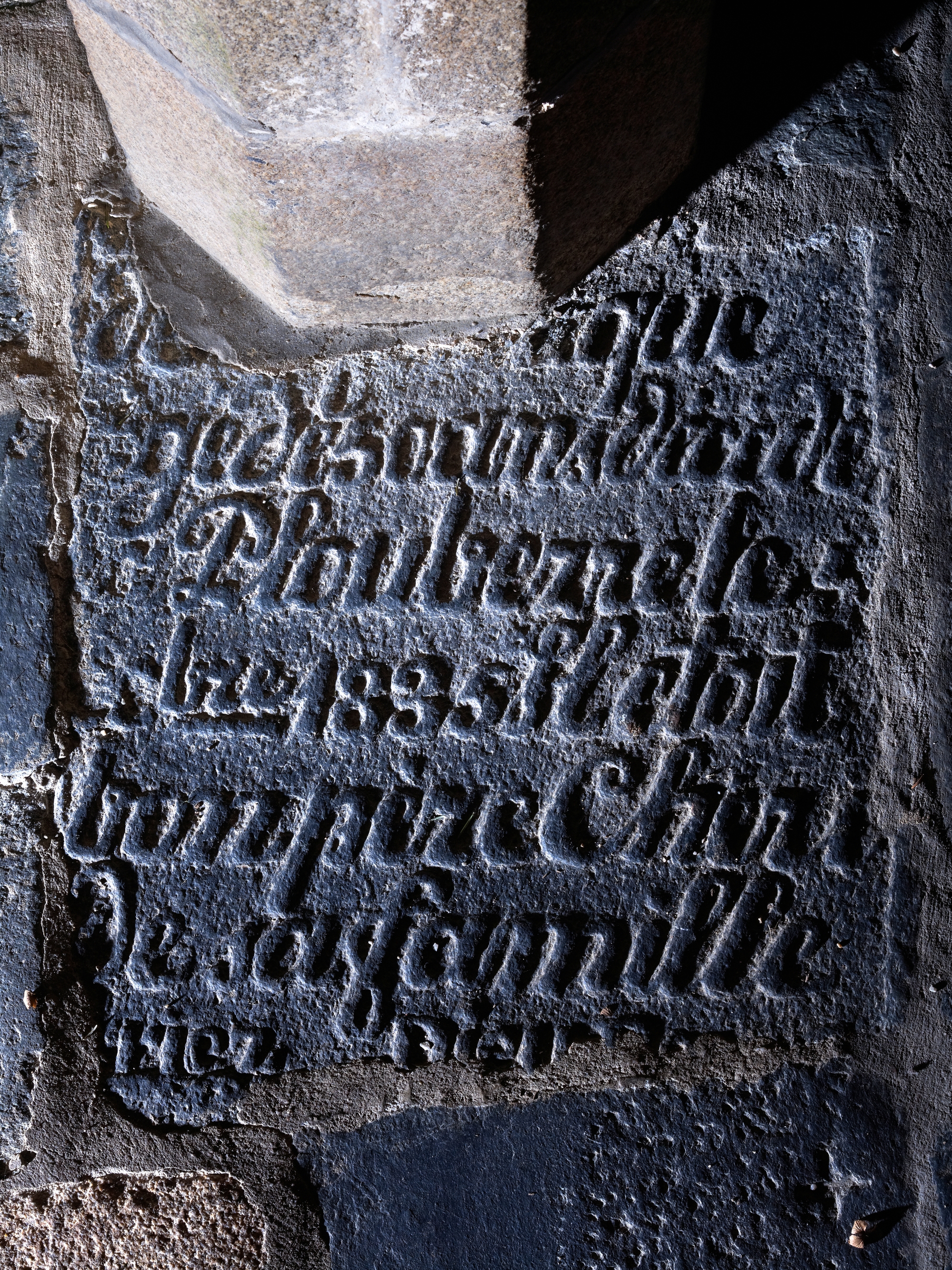 Ploubezre : église paroissiale, vue intérieure, détail d'une pierre tombaleImmatriculation