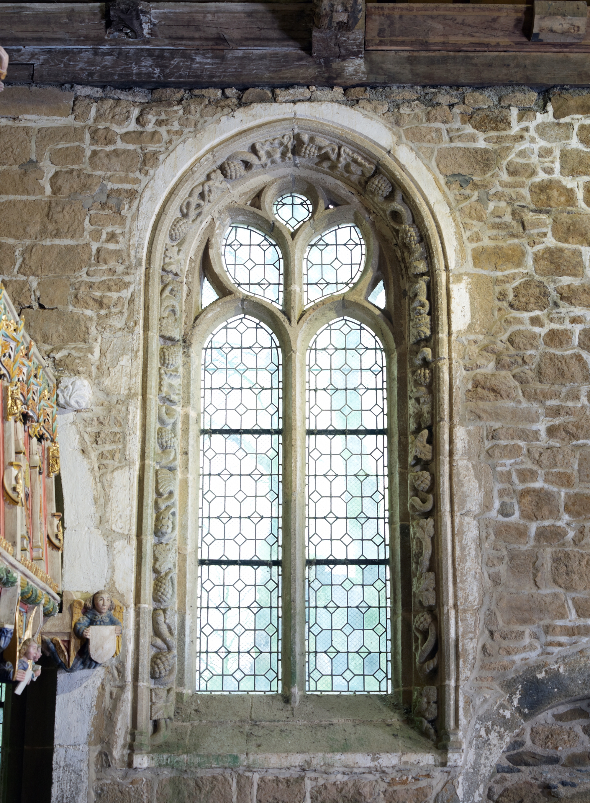 Ploubezre, chapelle de Kerfons : vue intérieure, remplage sud de style gothique flamboyant ornée de pampres de la nef. Il aurait été percé dans les premières années du 15e siècle par les KérimelImmatriculation