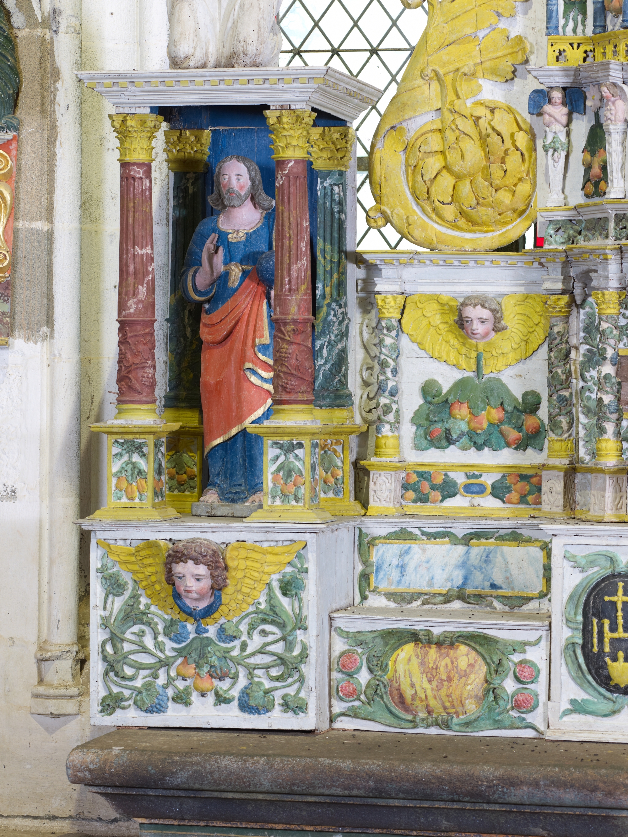 Ploubezre, chapelle de Kerfons : vue intérieure, détail du retable du maître-autel du 17e siècle. Ses niches latérales, ornées de colonnettes, abritent des statues du Christ et de la ViergeImmatriculation