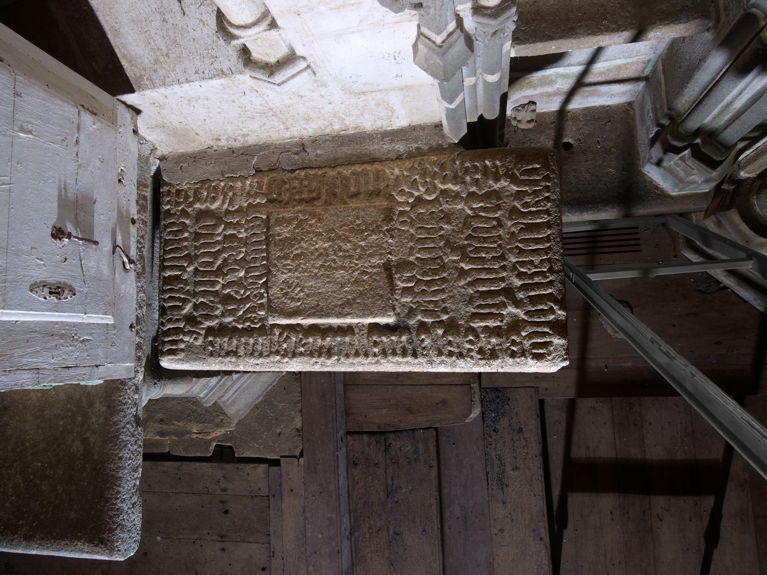Ploubezre, chapelle de Kerfons : vue intérieure, pierre tombaleImmatriculation