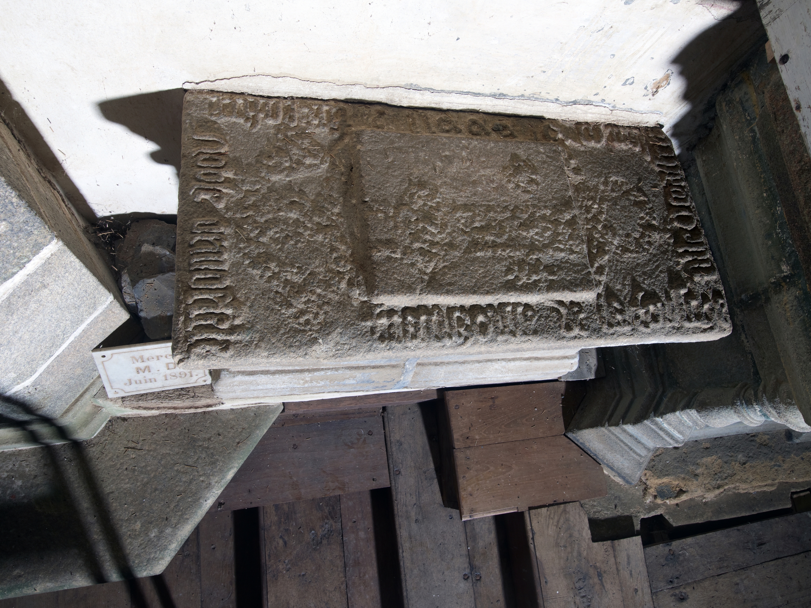 Ploubezre, chapelle de Kerfons : vue intérieure, pierre tombaleImmatriculation