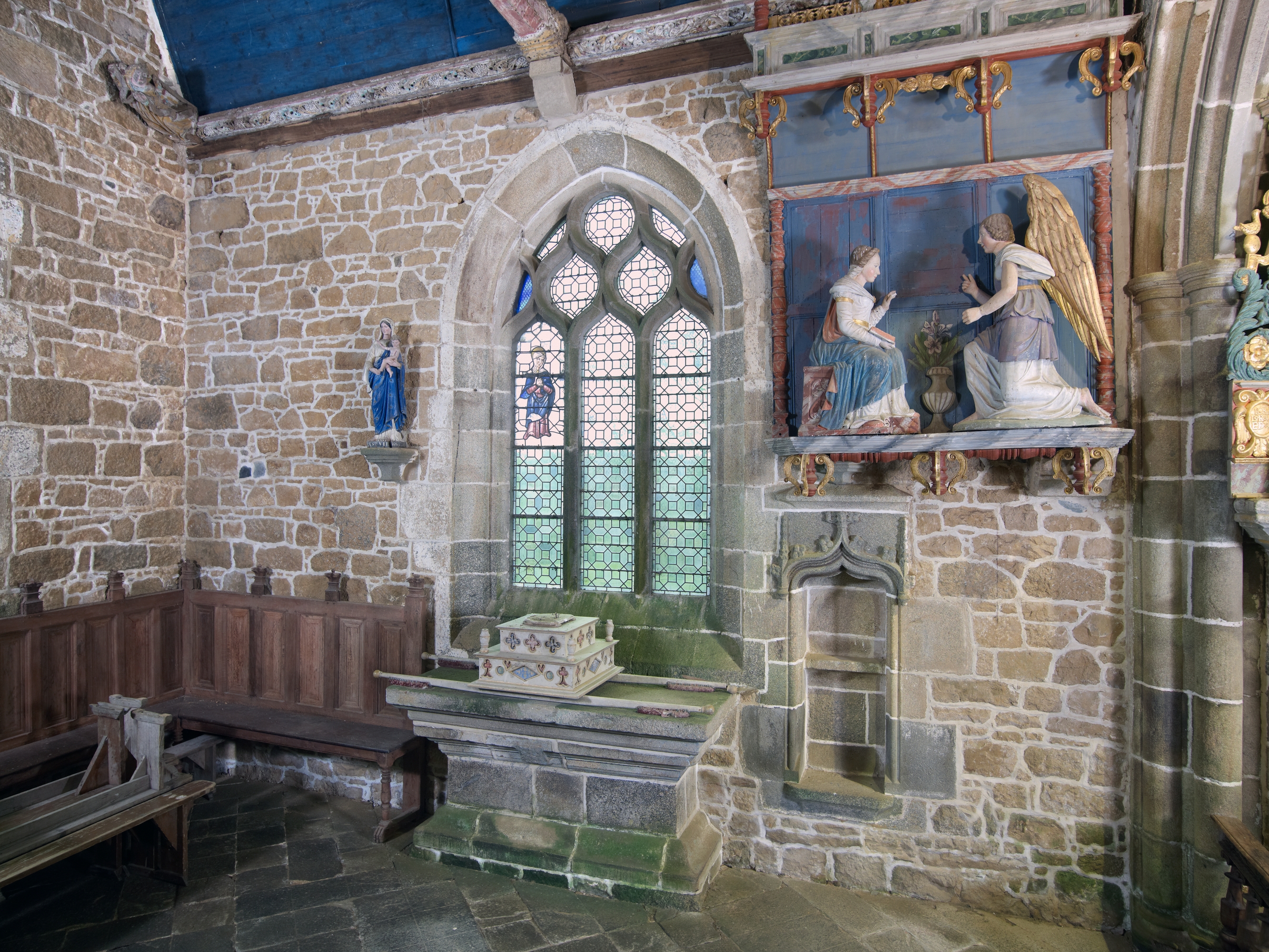 Ploubezre, chapelle de Kerfons : vue intérieure, chapelle nord comprenant autel, sacraire de style gothique flamboyant, groupe sculpté de l'Annonciation et Vierge à l'enfantImmatriculation