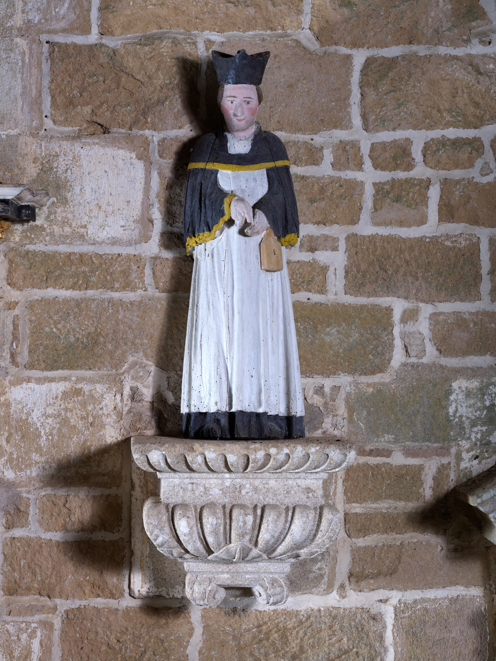 Ploubezre, chapelle de Kerfons : vue intérieure, statue de saint Yves (17e siècle). Il tient "un sac à procès", dans lequel on plaçait les rouleaux de parchemin des actes... Saint Yves est le saint patron de la Bretagne et des avocatsImmatriculation