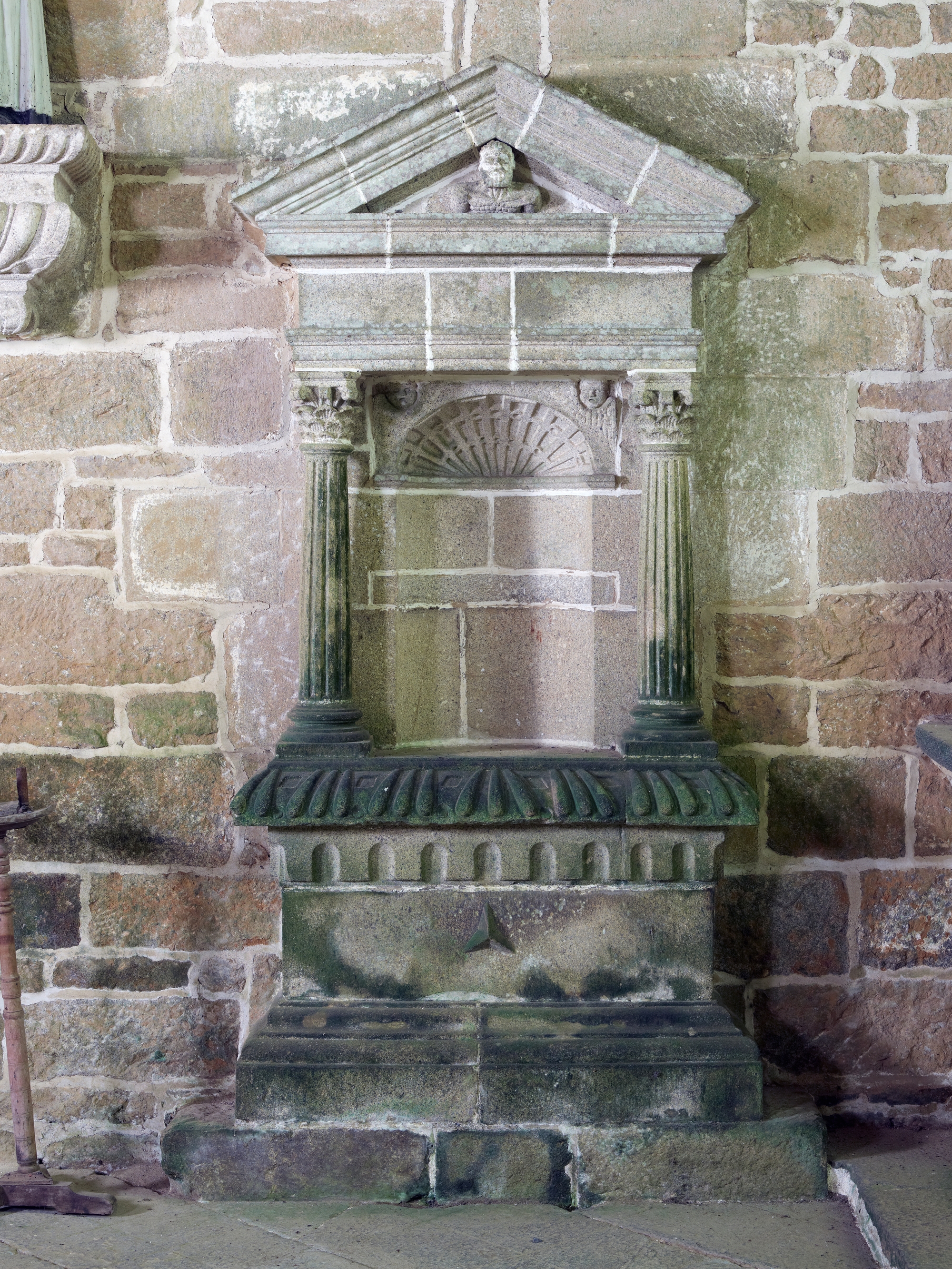 Ploubezre, chapelle de Kerfons : vue intérieure, chapelle latérale sud, détail de l'autel de style RenaissanceImmatriculation