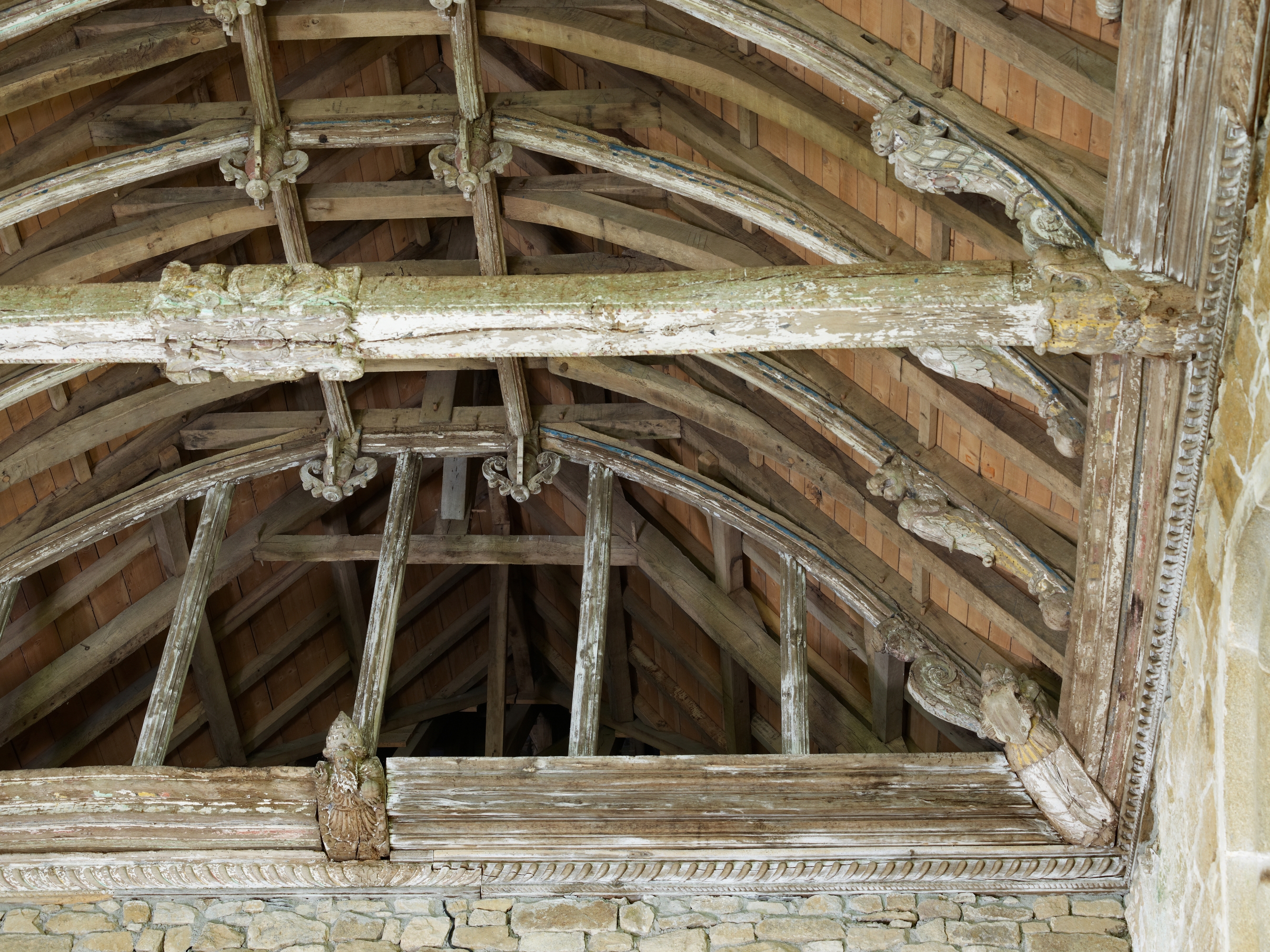 Ploubezre, chapelle de Kerfons : vue intérieure, détail de la charpente ancienne à entraits (engoulants), sablières et blochets sculptésImmatriculation