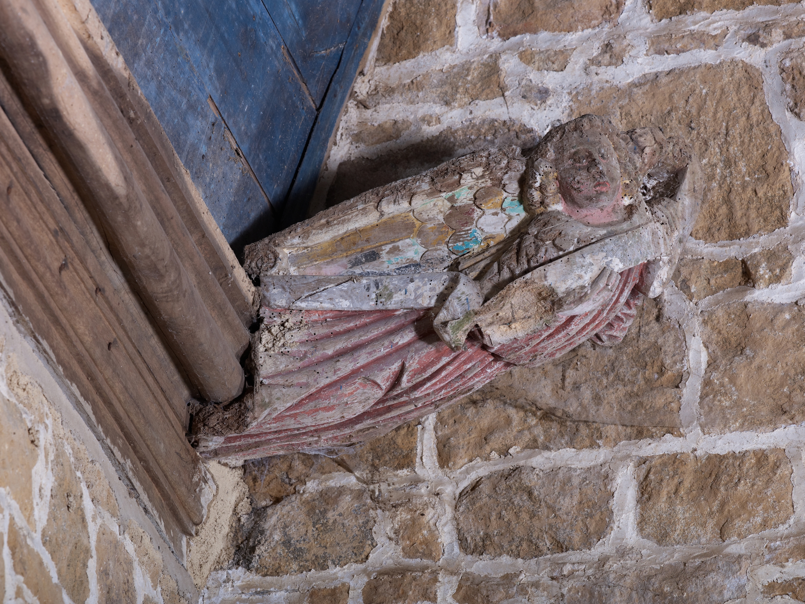 Ploubezre, chapelle de Kerfons : vue intérieure, sablière et blochet sculptésImmatriculation