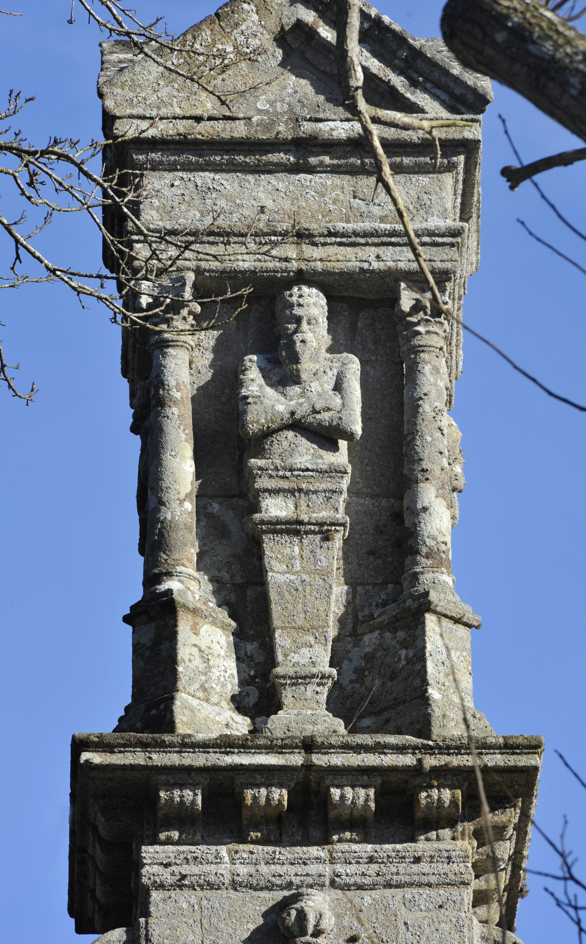 Ploubezre, chapelle de Kerfons : campanile de la chapelle sud au décor Renaissance. Il est flanqué de quatre personnagesImmatriculation