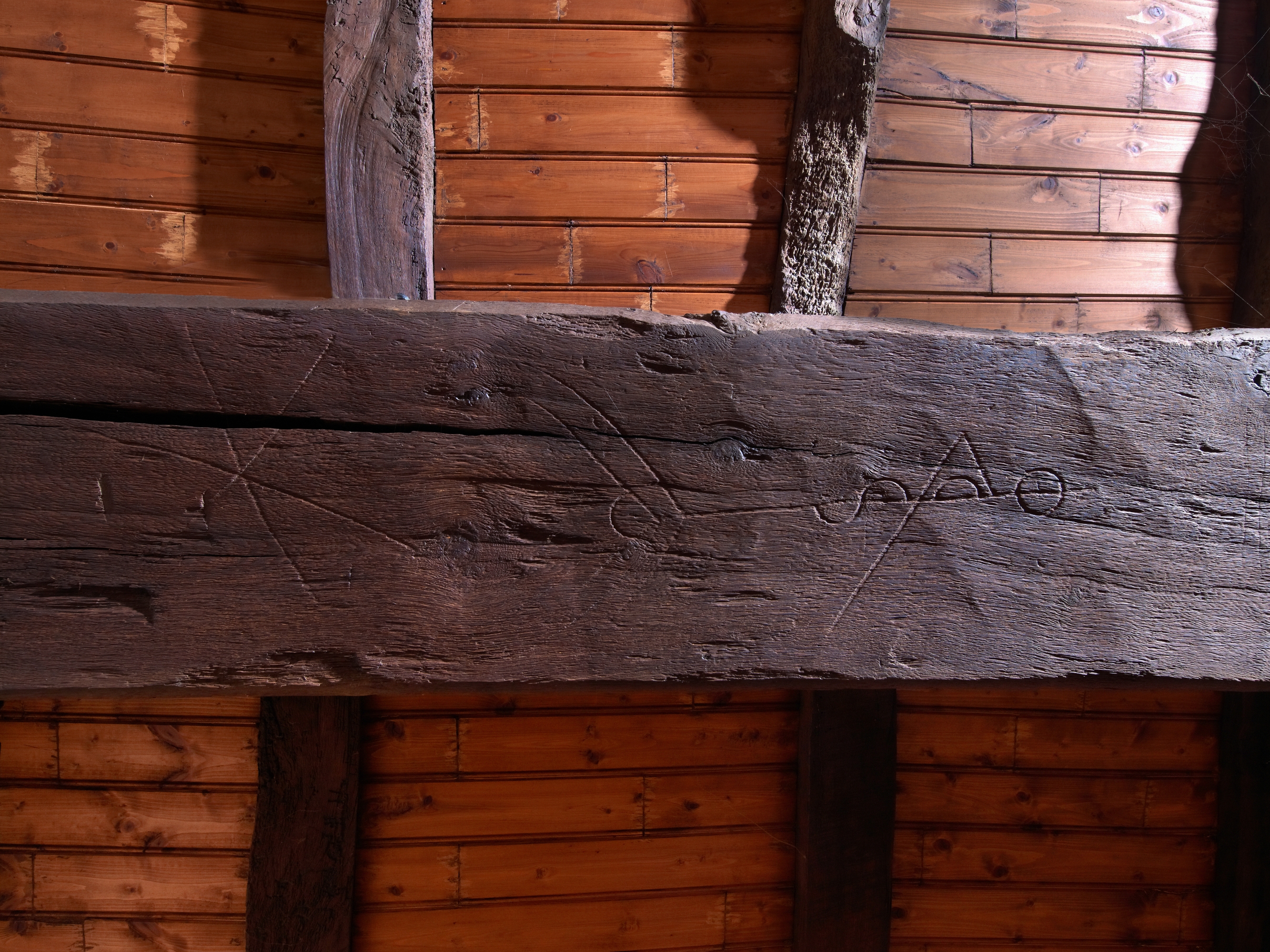 Chambre de l'étage. Poutre. Détail d'une marque de charpentier : équerre et monogramme du charpentier accroché au fil à plombImmatriculation