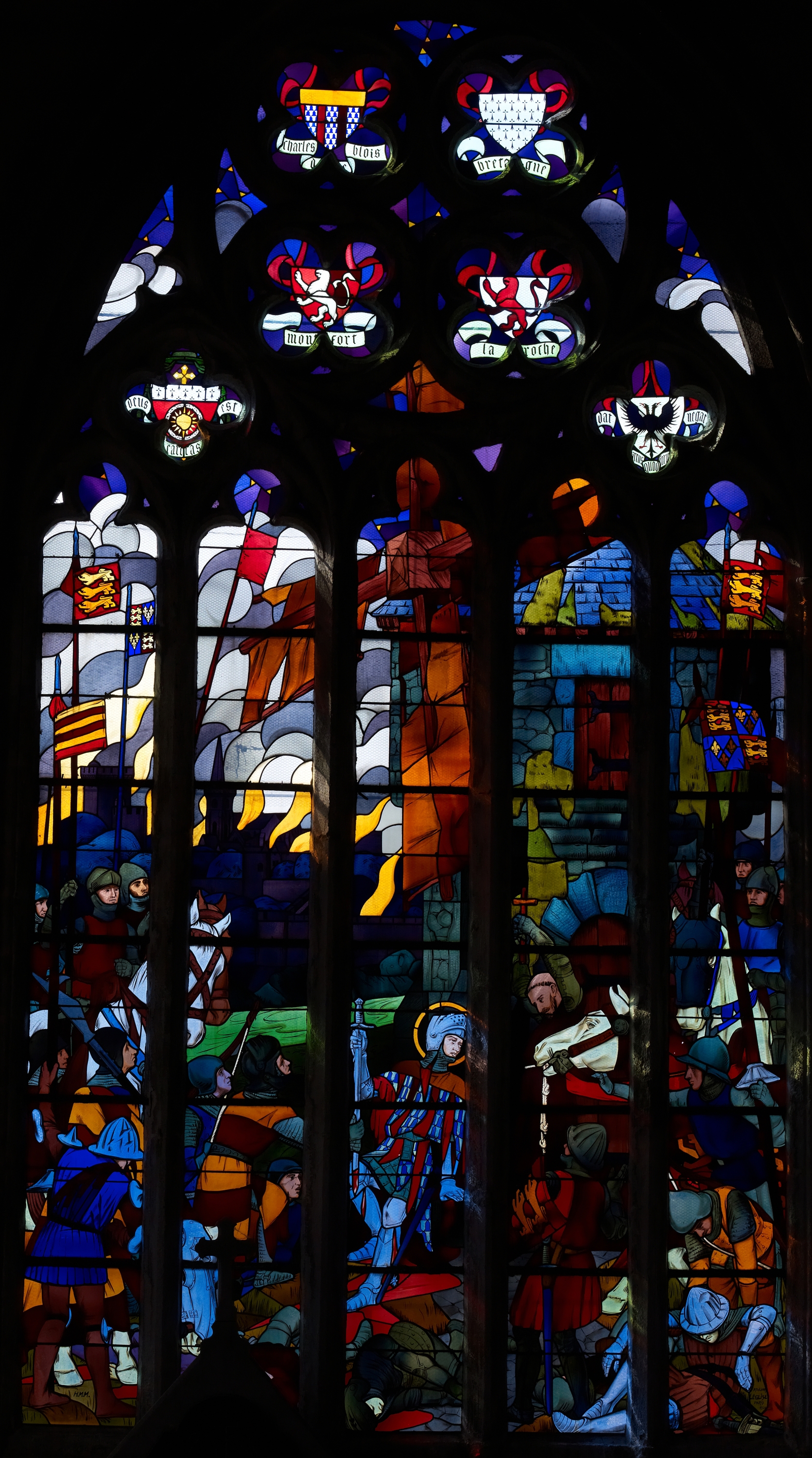 Chapelle sud. Mur sud. Verrière, 1927 : la reddition de Charles de blois à la bataille de La Roche-Derrien. Vue généraleImmatriculation