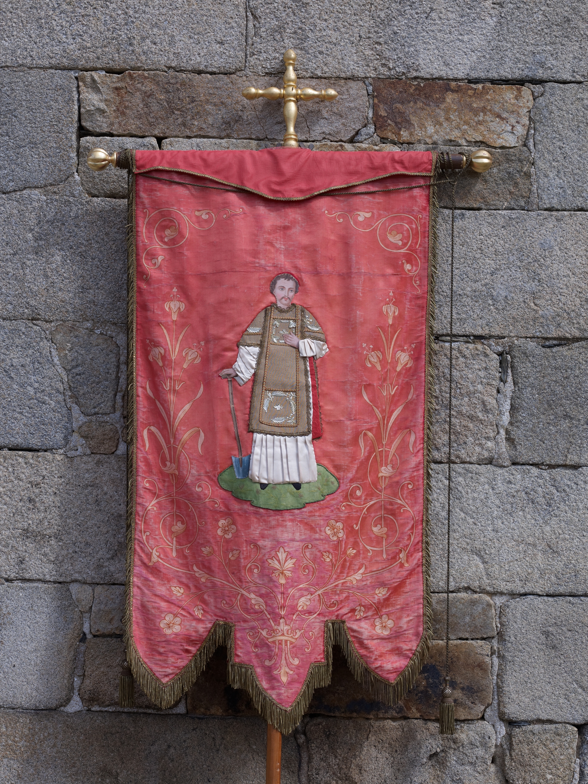 Ploubezre : bannière dediée à saint Fiacre. Patron des jardiniers, ses attributs sont la pelle et le missel (Collection Huon de Penanster)Immatriculation