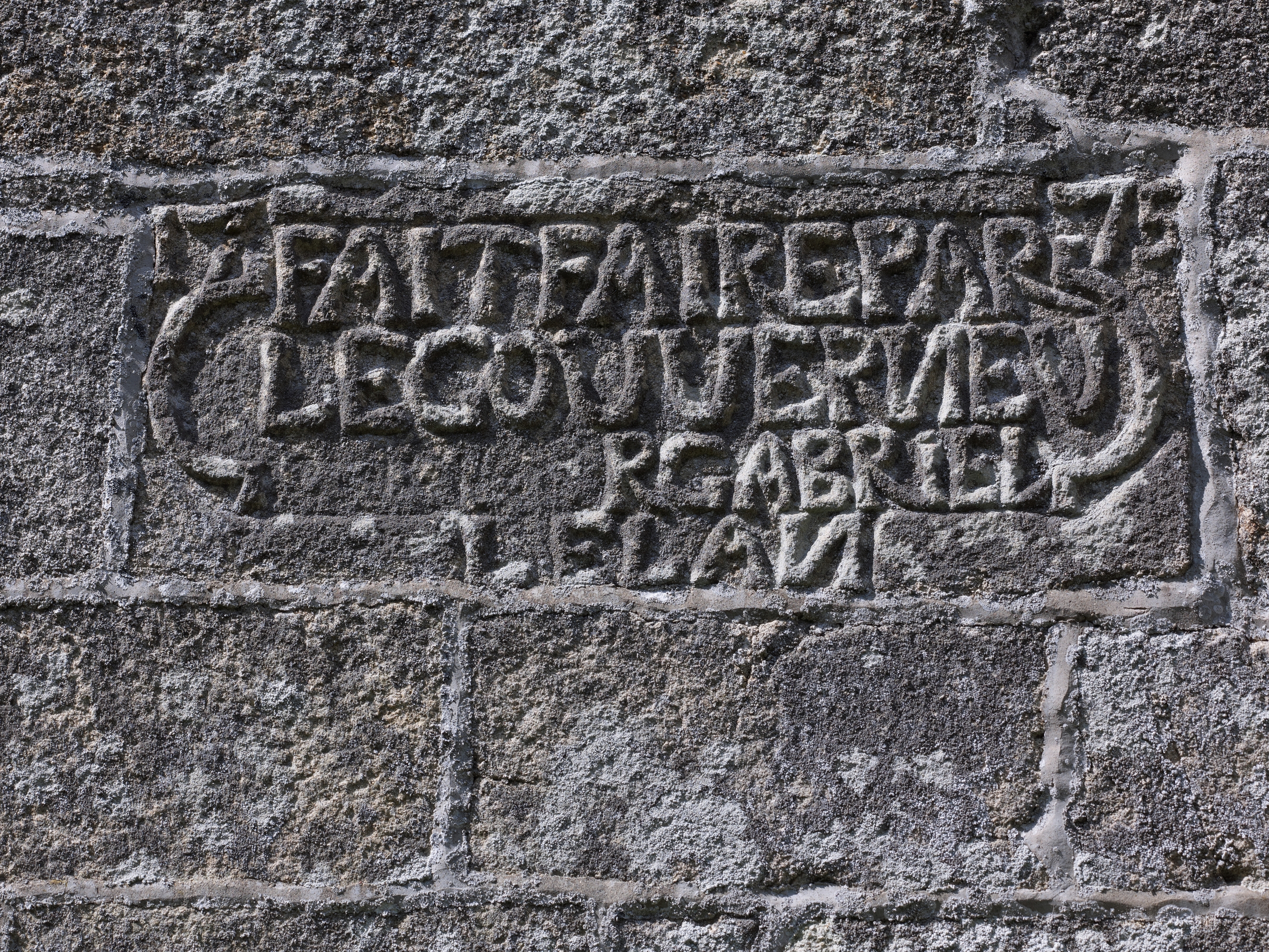 Ploubezre, Runfao : chapelle Saint-Fiacre, détail du mur sud. Il porte le millésime et l'inscription suivante : "17/75 / FAIT FAIRE PA/R LE GOUVERNEU/R GABRIEL/LE LAN"Immatriculation