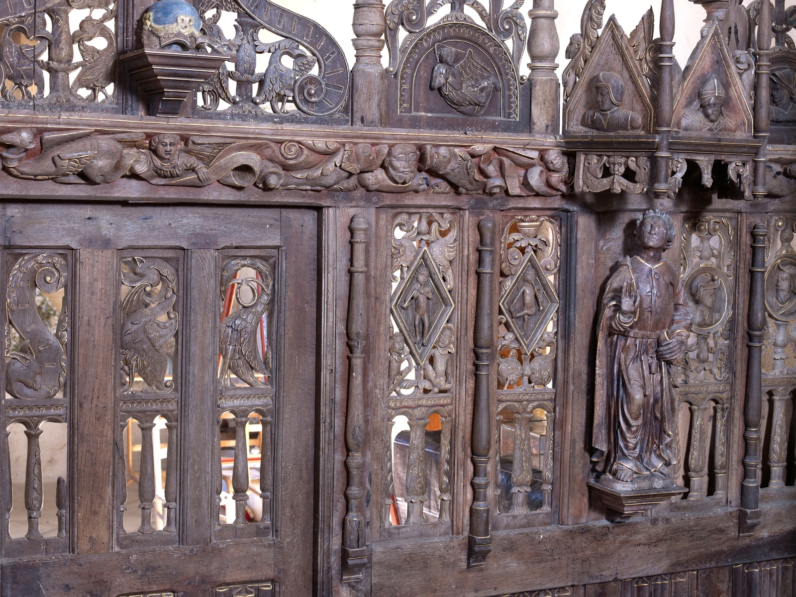 Ploubezre, Runfao : chapelle Saint-Fiacre, clôture en bois isolant la chapelle funéraire des châtelains de Kergrist, détail des panneauxImmatriculation
