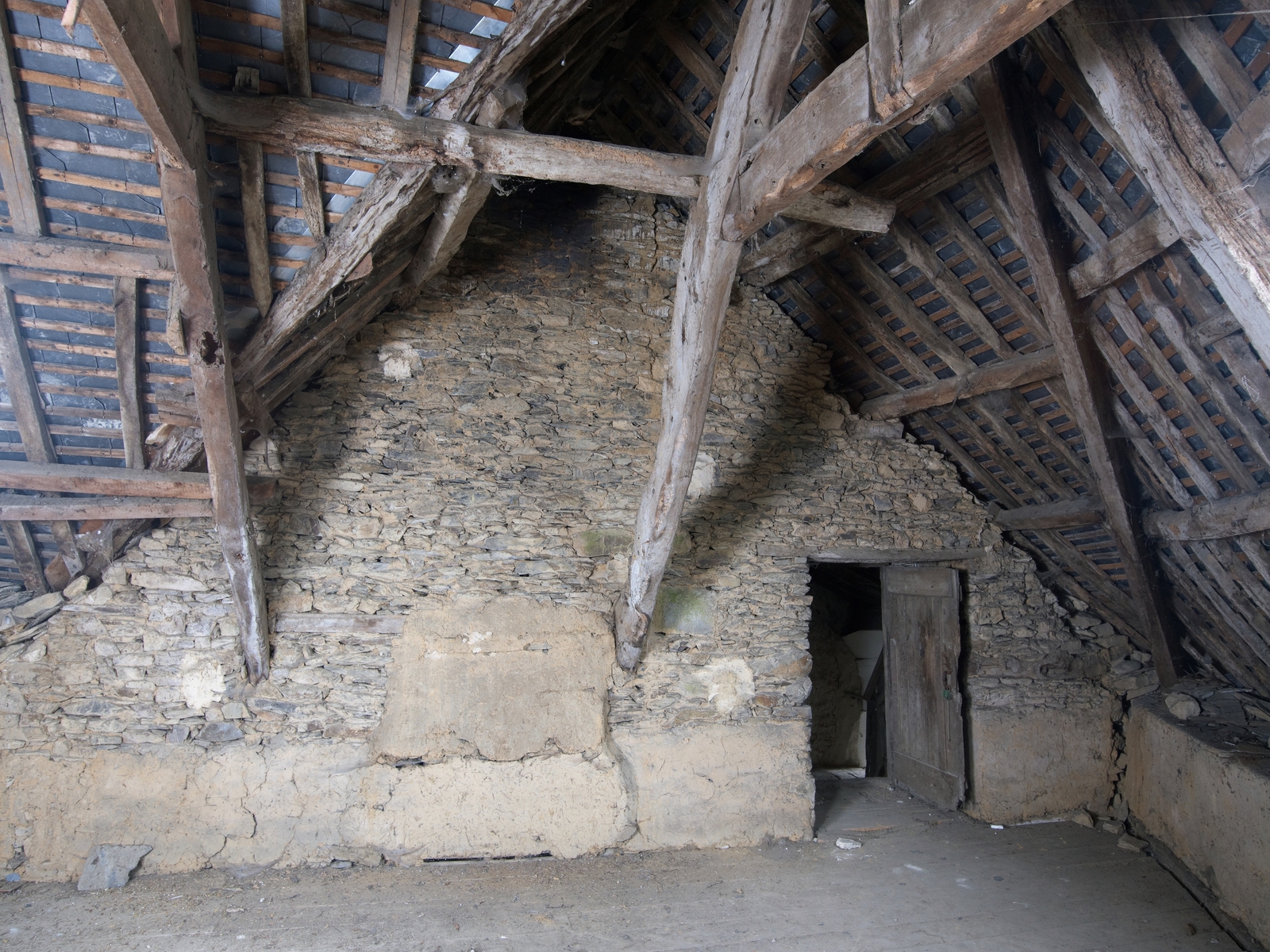 Combles. Charpente du toit à croupe et porte ouvrant sur la tour d'escalier. Vue généraleImmatriculation