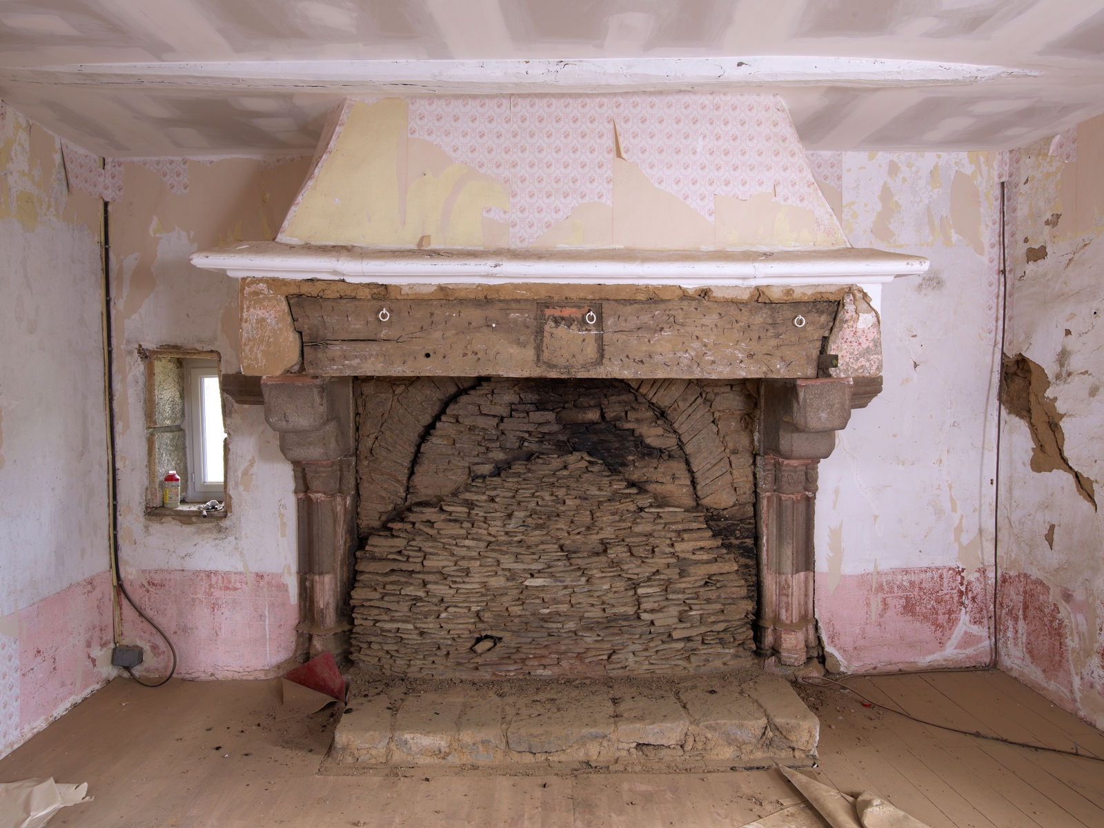 Ploubezre, Le Launay : manoir, extrémité sud, étage, salle haute sous charpente, cheminée et baie orientée vers le sud. Les armoiries devaient être peintes. L'arc de décharge de la cheminée permettait de changer les pierres du foyerImmatriculation