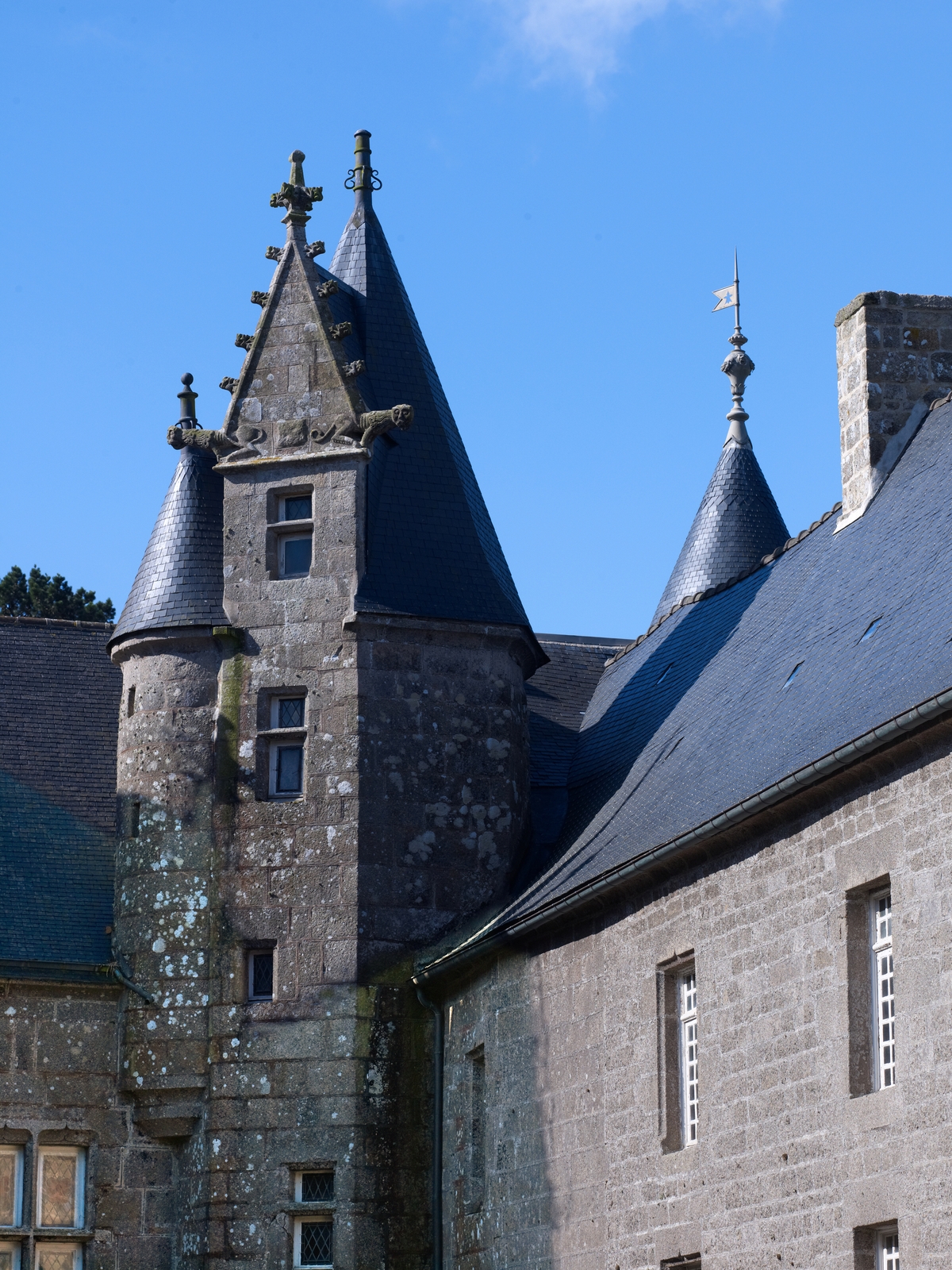 Ploubezre : château de Kergrist, vue depuis le nord-est. Partie supérieure de la tour d'escalier de l'ancien manoir ; elle est dominée par une lucarne de style gothique à gâble aiguImmatriculation