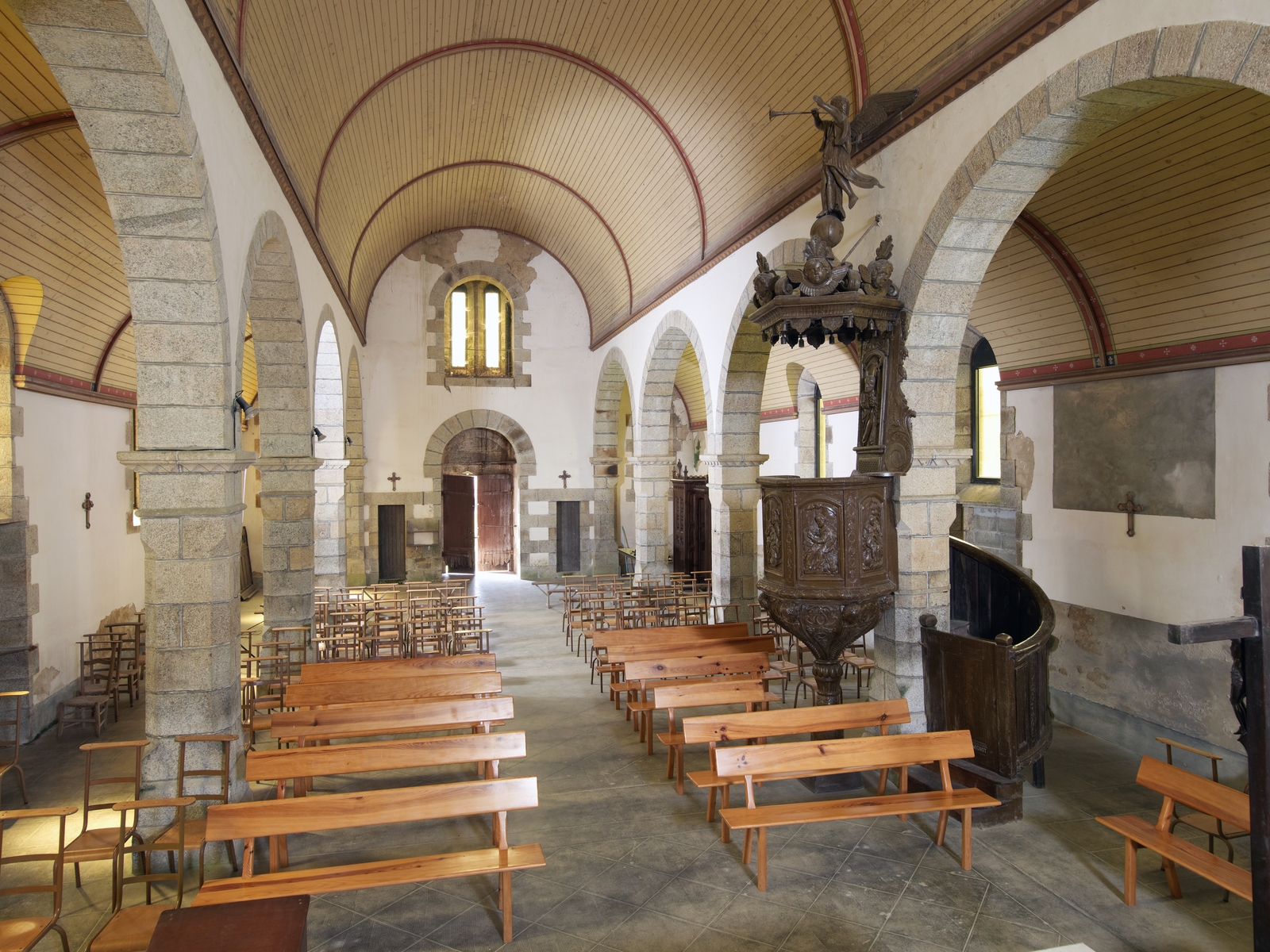 Ploubezre, Kerauzern : chapelle Notre-Dame de Kergrist, vue générale de la nef vers l'ouest. A droite : la chaire à prêcherImmatriculation