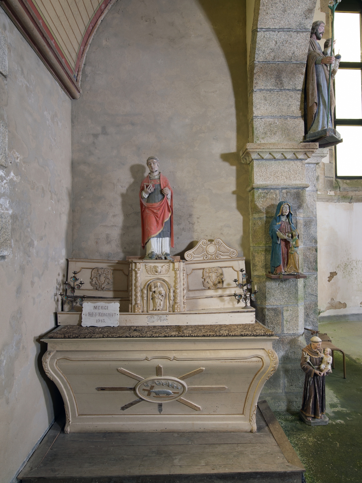 Ploubezre, Kerauzern : chapelle Notre-Dame de Kergrist, vue intérieure, retable ouest et statue de saint YvesImmatriculation