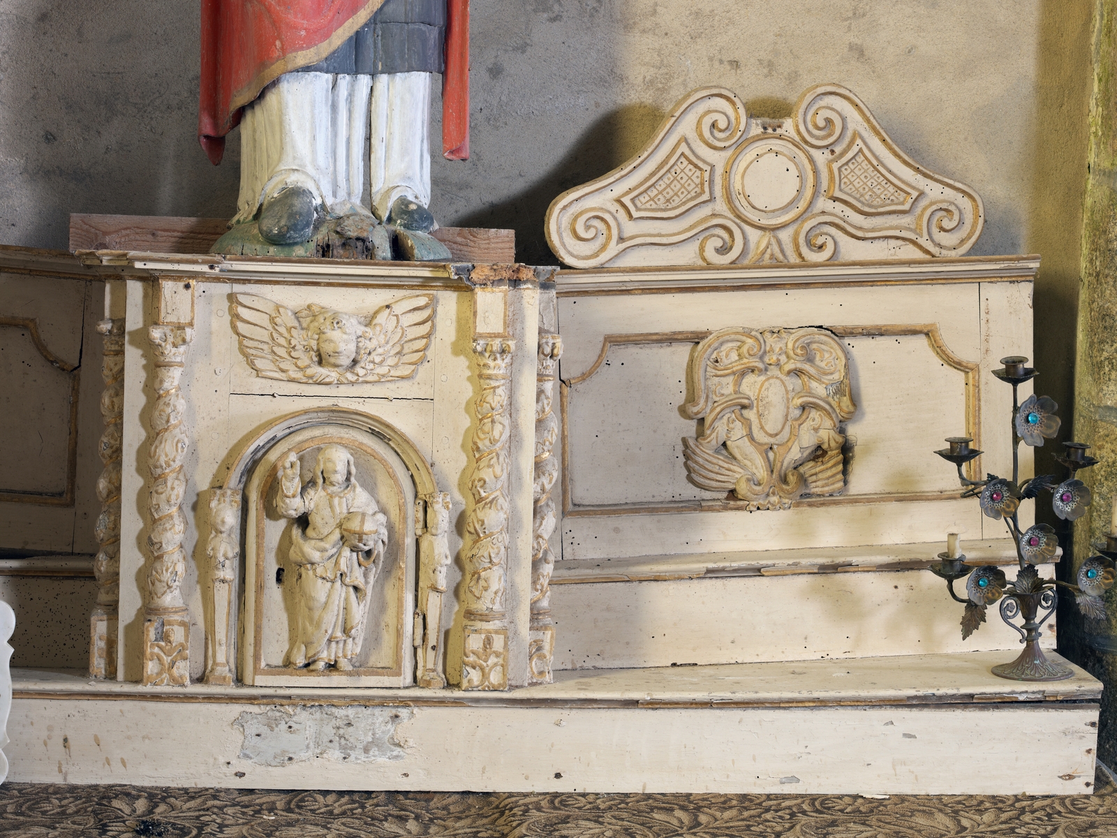 Ploubezre, Kerauzern : chapelle Notre-Dame de Kergrist, vue intérieure, vue de détail du retable ouestImmatriculation