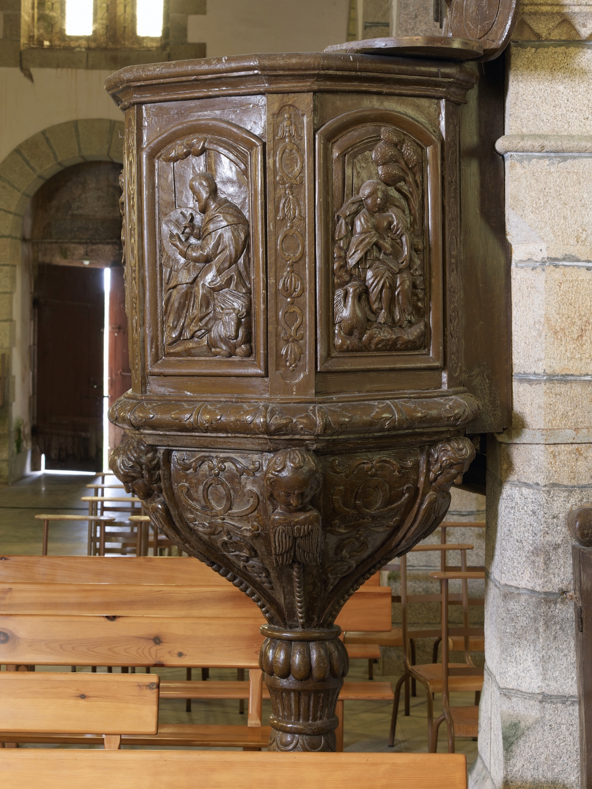 Ploubezre, Kerauzern : chapelle Notre-Dame de Kergrist, vue de détail de la chaire à prêcherImmatriculation