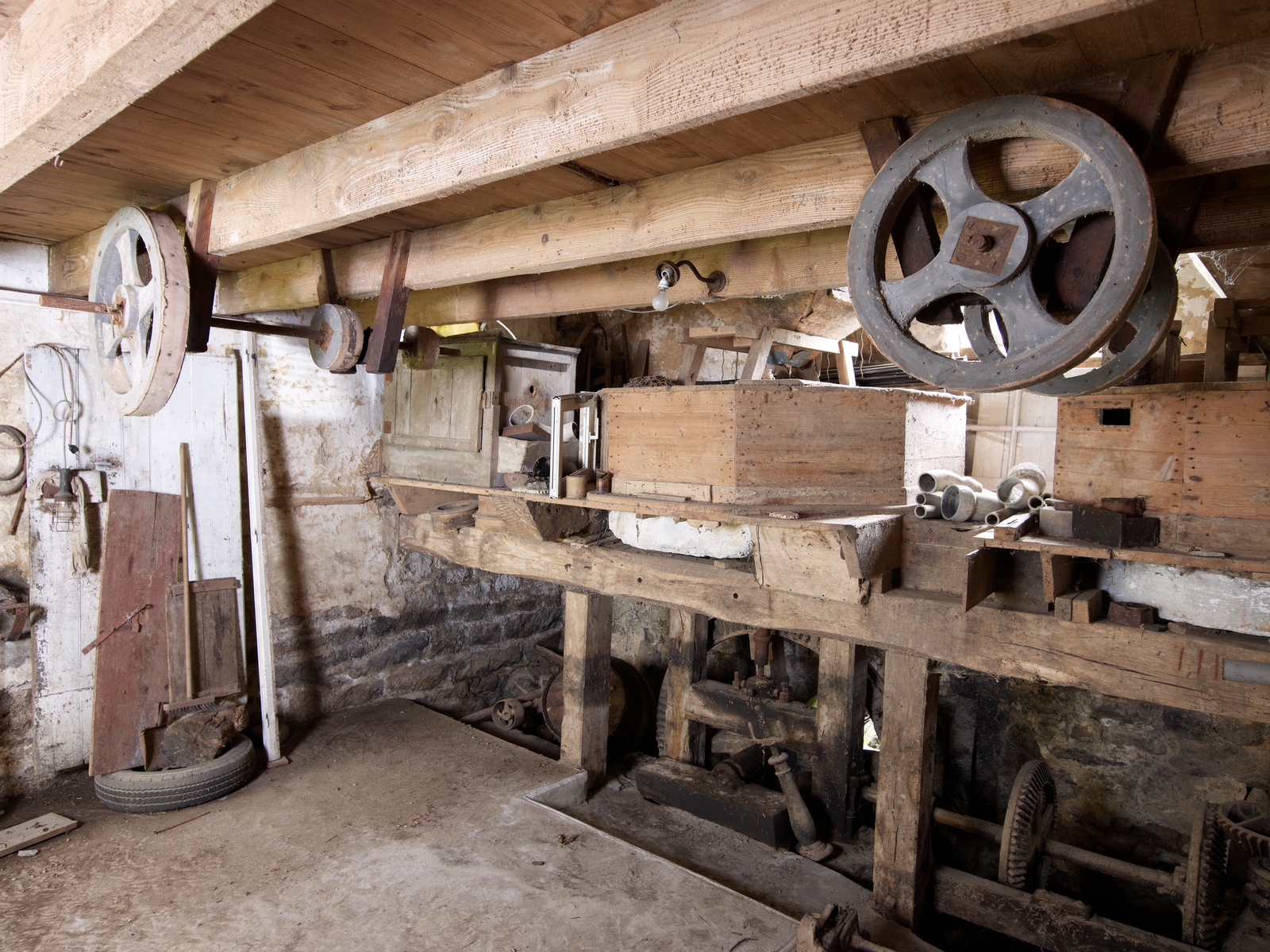 Vue intérieure, détail des mécanismes des deux meules et poulies d'entrainementImmatriculation