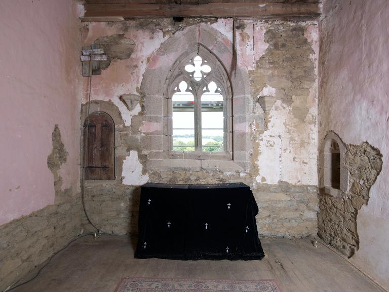 Logis-porte. Premier étage. Chapelle domestique : fenêtre encadrée par le sacraire et la crédence liturgiqueImmatriculation