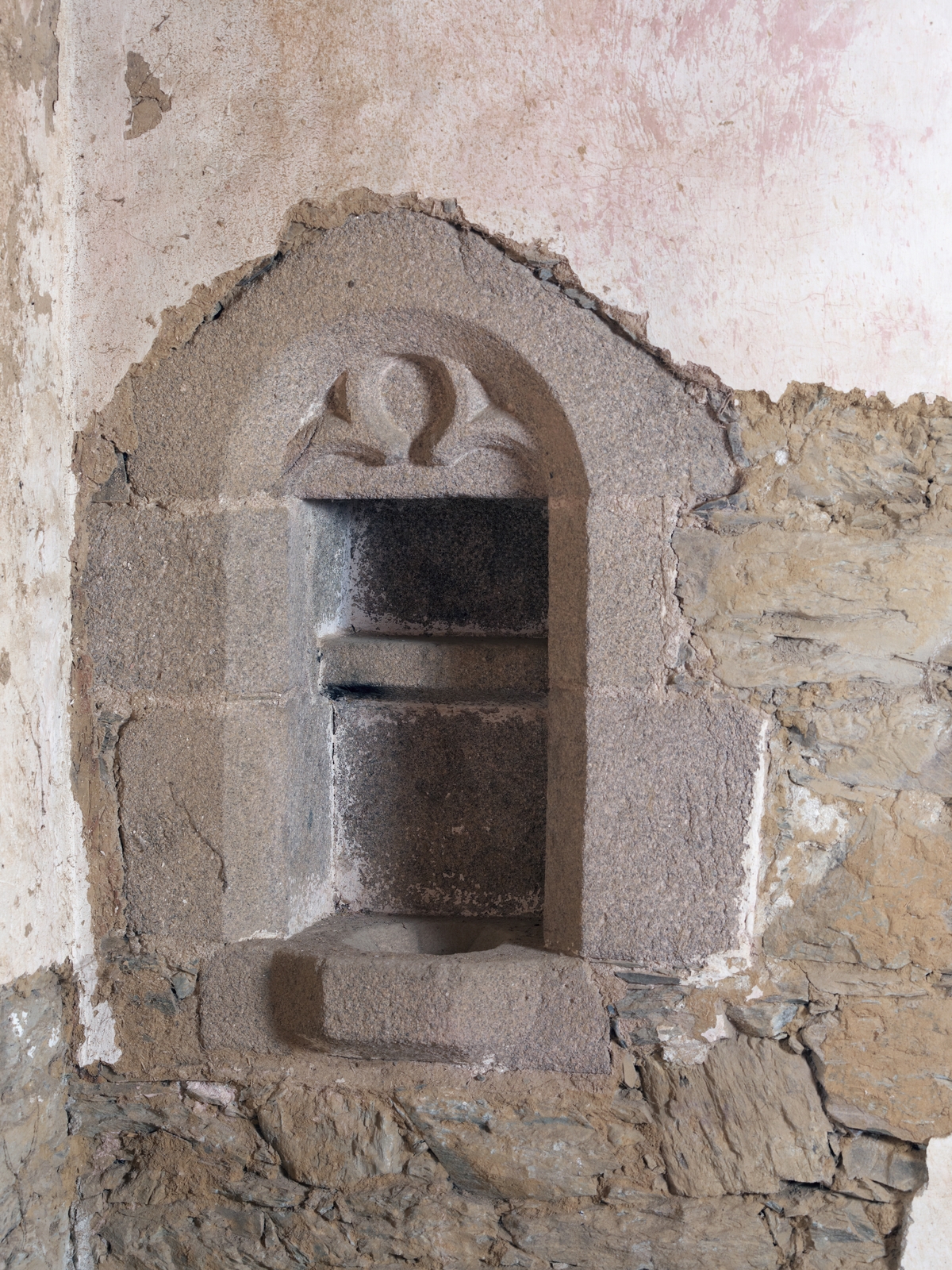 Logis-porte. Premier étage. Chapelle domestique. Détail de la crédence liturgiqueImmatriculation