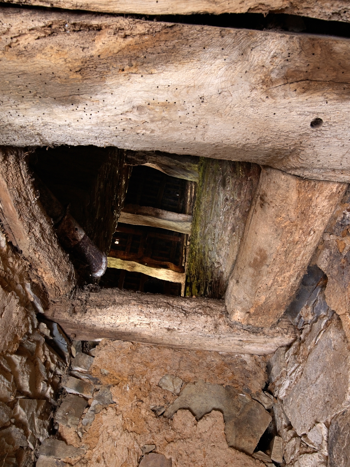 Logis-porte. Premier étage. Salle haute située au nord. Latrines. Détail de la trappe ouvrant sur la cachette aménagée dans le double pignon nordImmatriculation