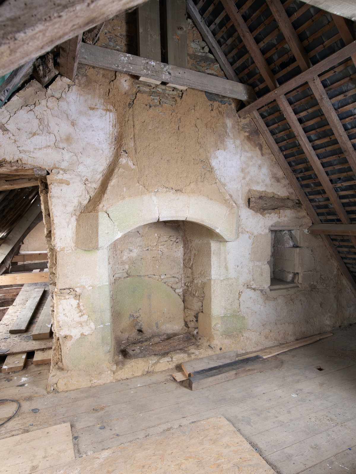 Comble. Salle de guet. Cheminée à linteau clavé en arc segmentaire avec blasons des Coëtgoureden et des Coëtfrec au bas des piédroitsImmatriculation