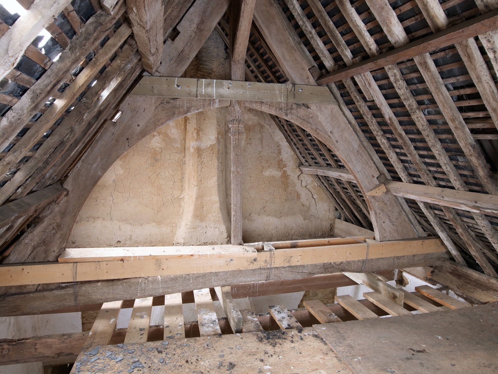 Comble. Charpente. Détail d'une ferme à arbalétriers et aisseliers courbes, entrait à poinçon octogonalImmatriculation