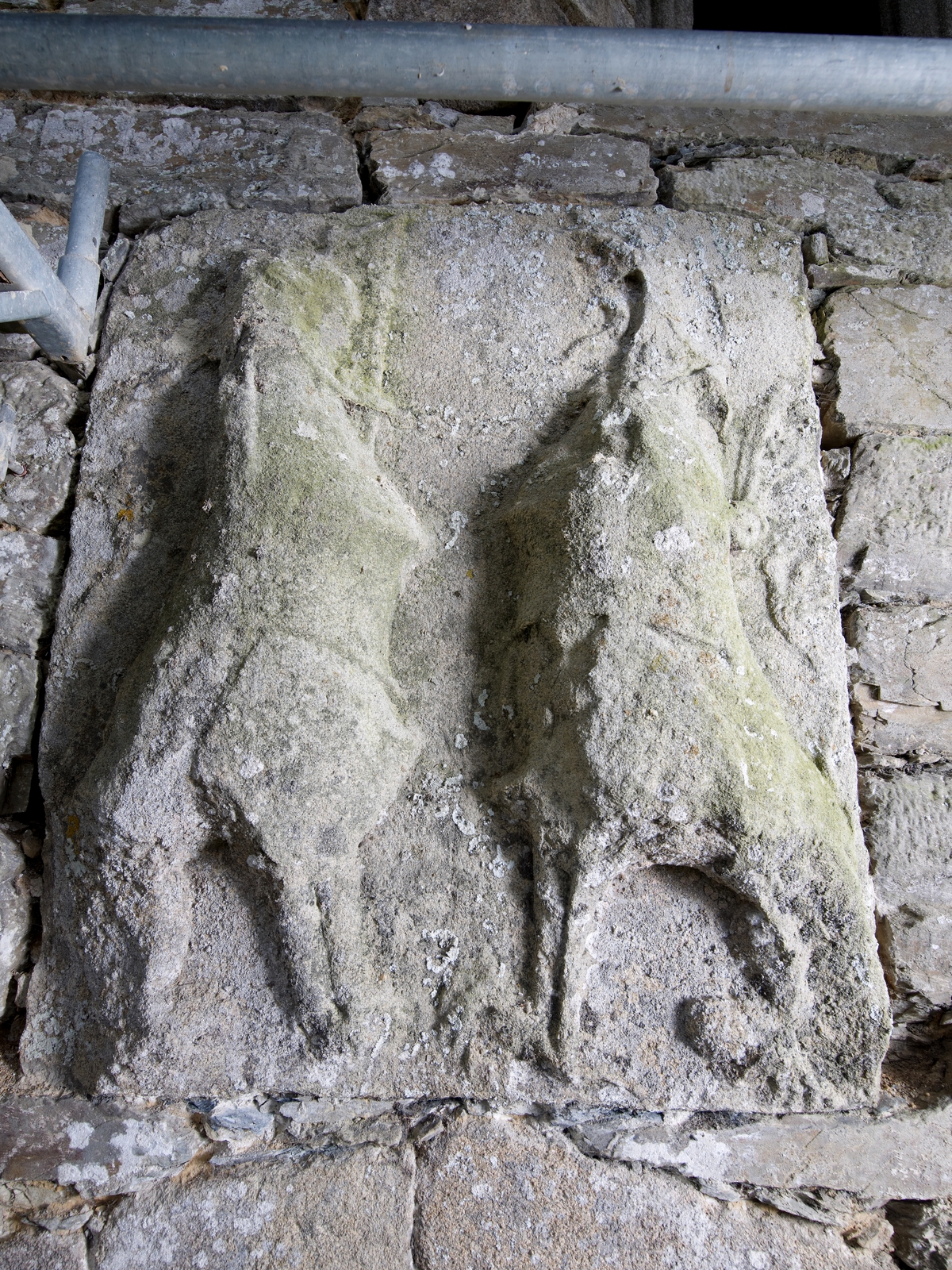 Logis-porte. Elévation est. Pierre sculptée au-dessus du portail du logis-porte : supports de blason en forme de lion et de griffon coiffés d'un heaumeImmatriculation