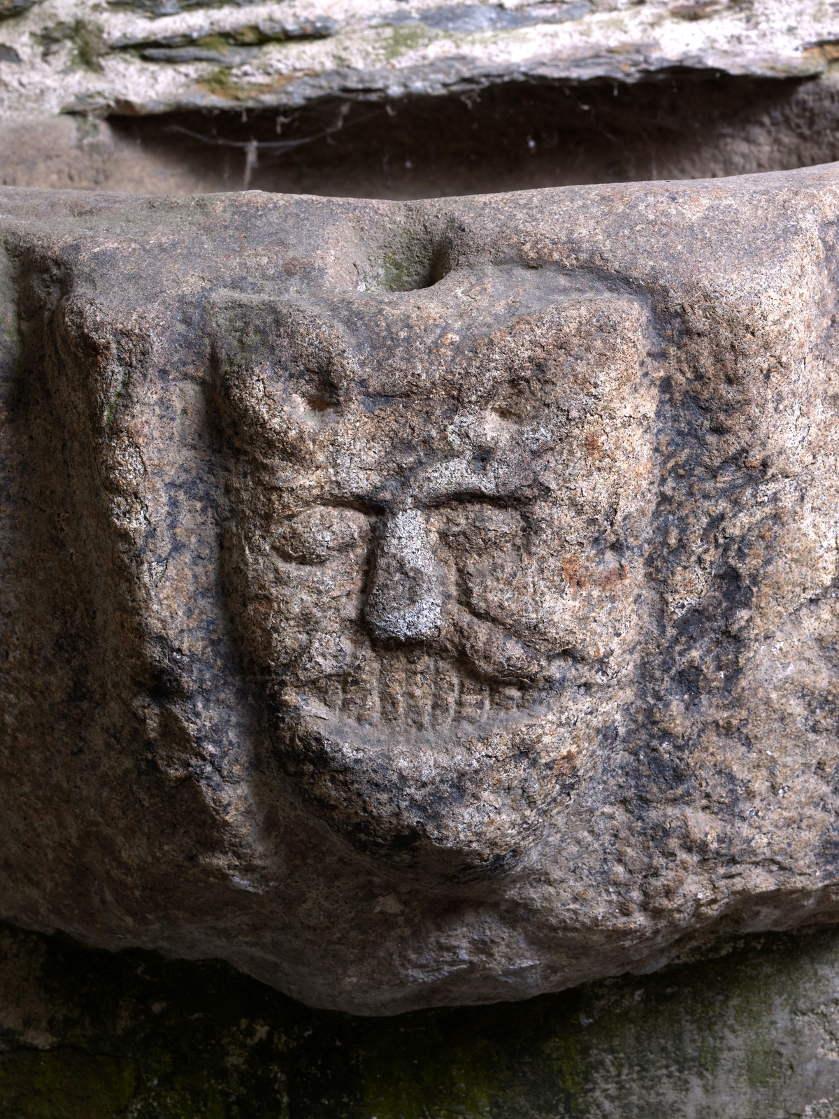 Porche sud. Bénitier, 14e siècle. Détail d'une tête sculptée mi-homme mi-loupImmatriculation