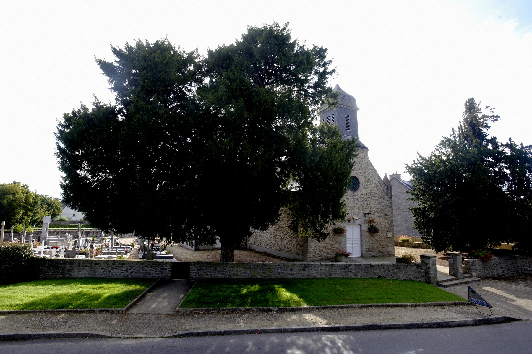 Le clocher de l'église et le cimetière, vue de la voie publique.Immatriculation
