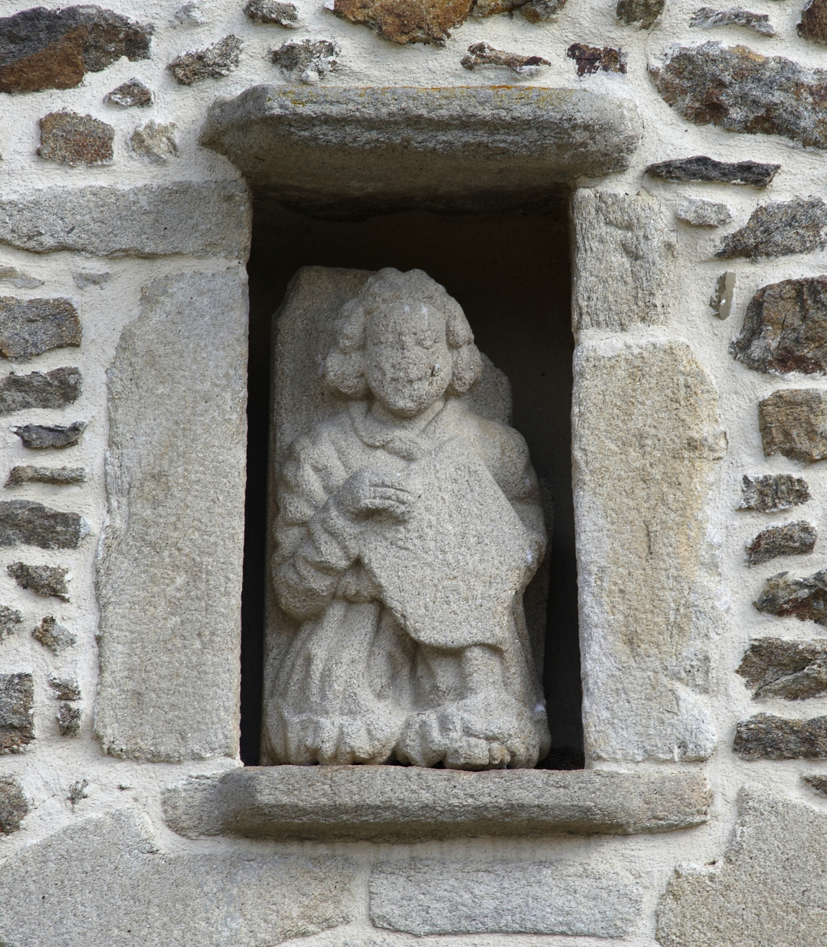 Détail : niche à statue imbriquée dans la façade principale, accueillant un personnage sculpté inconnu. Vue de la cour.Immatriculation