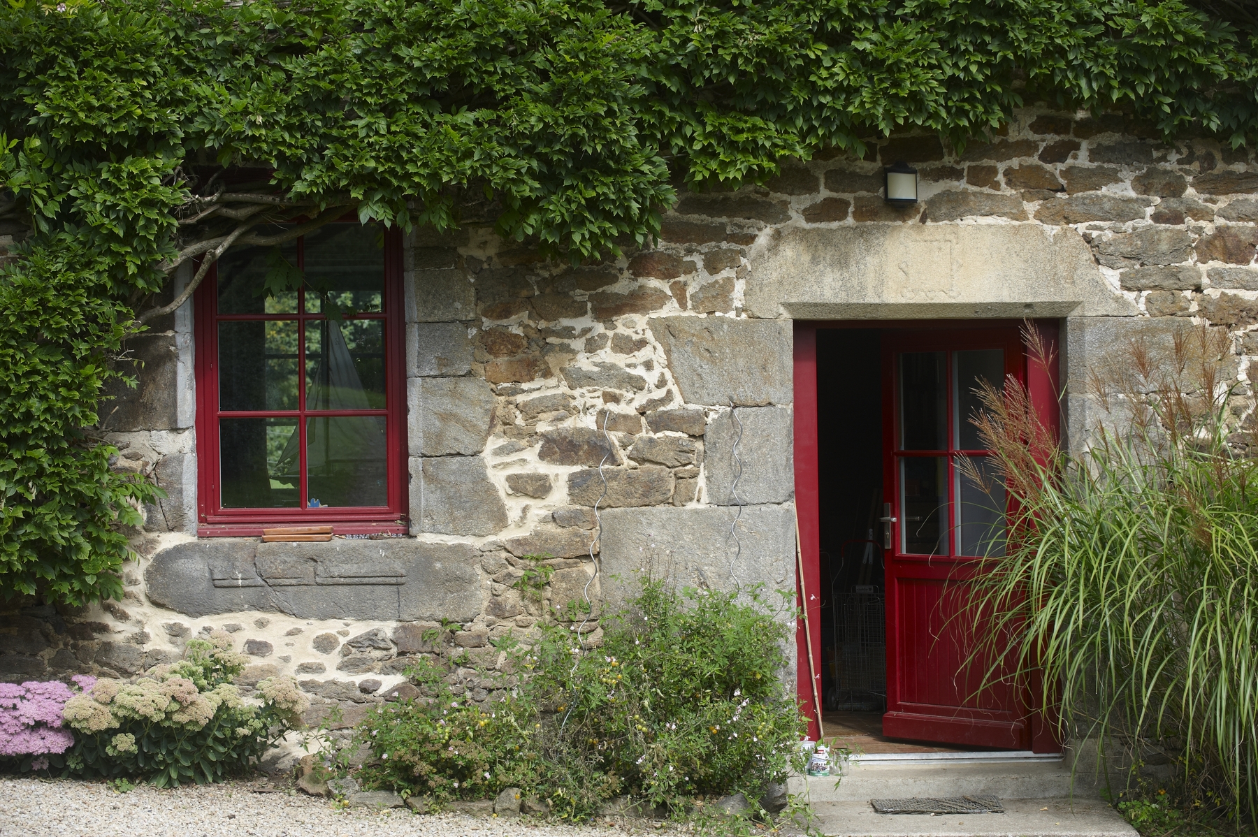 Détail : la deuxième porte, surmontée d'un linteau sculpté. Vue de la voie publique.Immatriculation