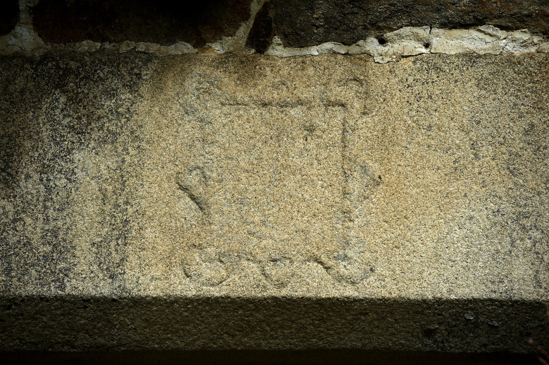 Détail : linteau sculpté, présentant un écu muet entouré d'une crodelière. Vue de la voie publique.Immatriculation