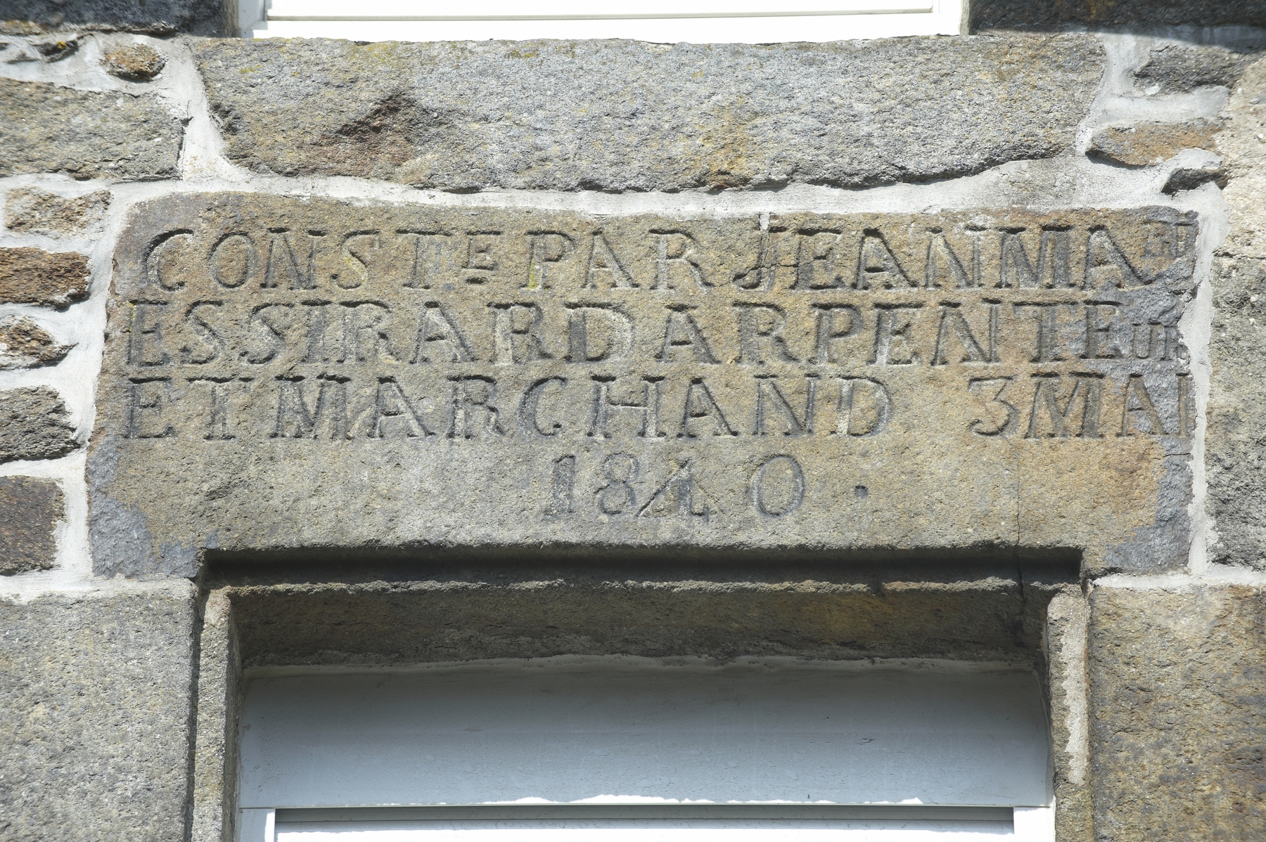 Deuxième maison mitoyenne, détail inscription : CONST(RUT)E PAR JEAN MARIE ESSRARD ARPENTEUR ET MARCHAND 3 MAI 1840Immatriculation