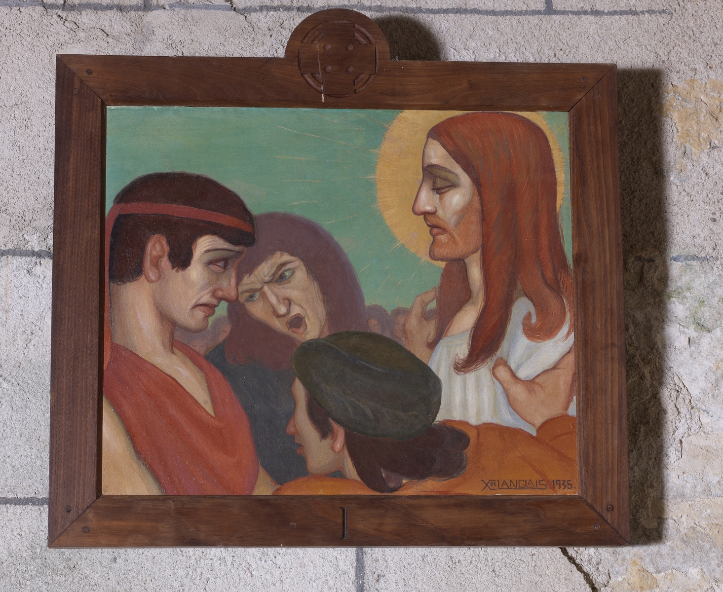 Trémel, le bourg : église paroissiale Notre-Dame, vue intérieure, Chemin de Croix (I : "Jésus est condamné à être crucifié"), œuvre de Xavier de Langlais (1935)Immatriculation