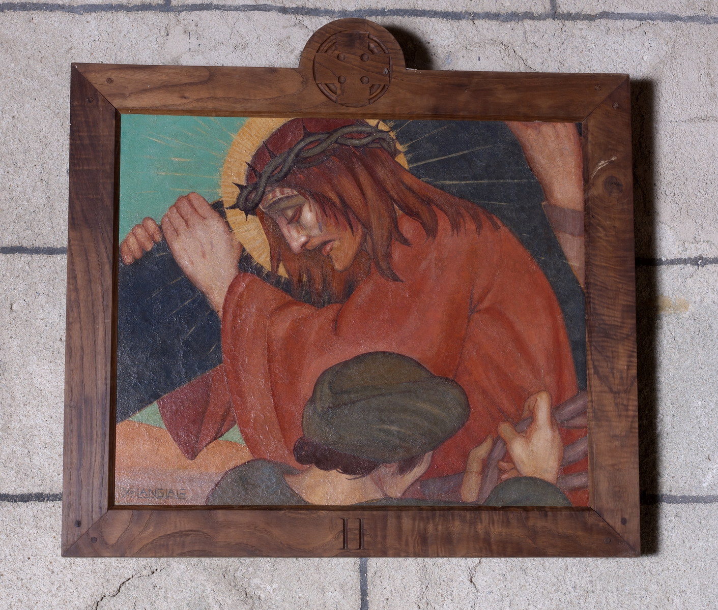 Trémel, le bourg : église paroissiale Notre-Dame, vue intérieure, Chemin de Croix (II : "Jésus est chargé de sa croix"), œuvre de Xavier de Langlais (1935)Immatriculation