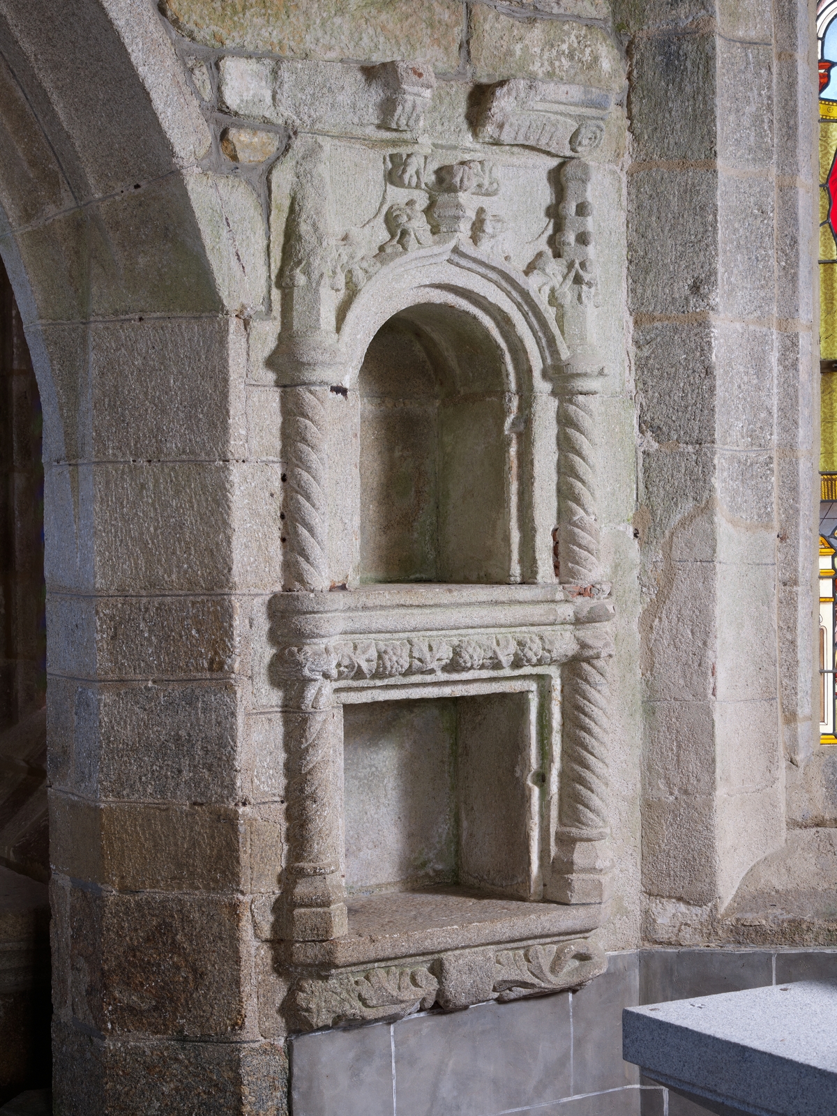 Trémel, le bourg : église paroissiale Notre-Dame, vue intérieure, sacraire au décor flamboyantImmatriculation