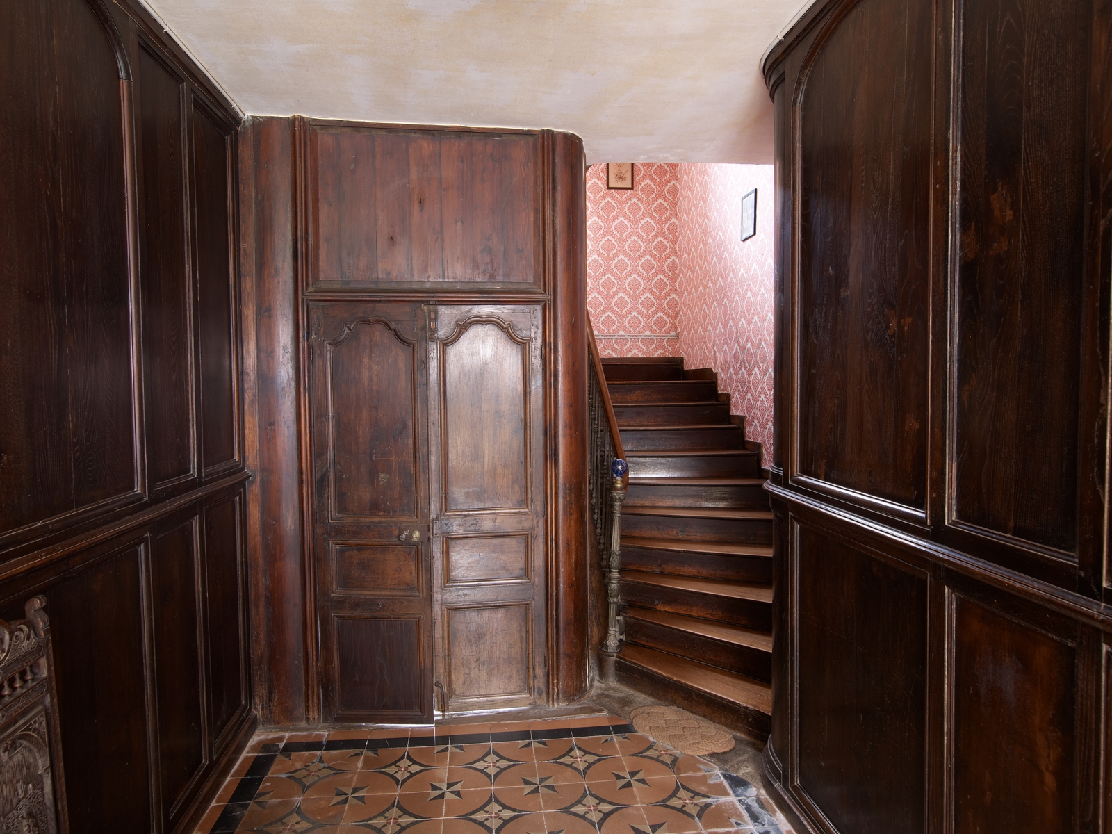 Logis principal. Hall d'entrée couvert de lambris, escalier d'accès à l'étage et porte à double battant ouvrant sur le sas de la cuisineImmatriculation
